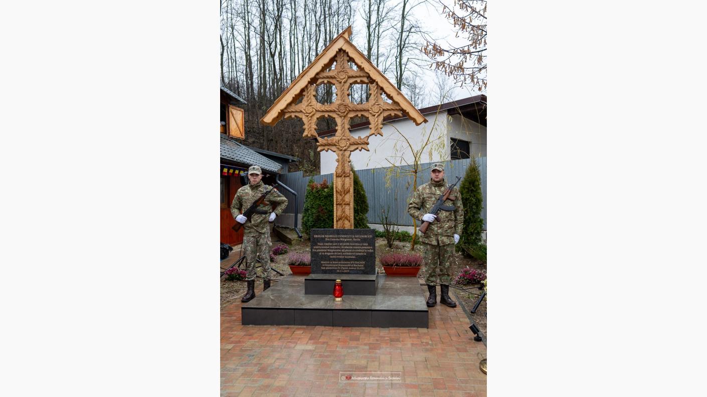 Sfințirea monumentului dedicat eroilor care și-au jertfit viața pentru propășirea neamului românesc și păstrarea identității naționale a debutat cu intonarea Imnului Național „Deșteaptă-te, române!” de către fanfara militară. În continuare, PS Părinte Teofil Trotușanul a oficiat slujba de sfințire și a dat citire Mesajului la Ziua Națională transmis de IPS Părinte Arhiepiscop Ioachim, pe care îl uteți citi integral aici.
