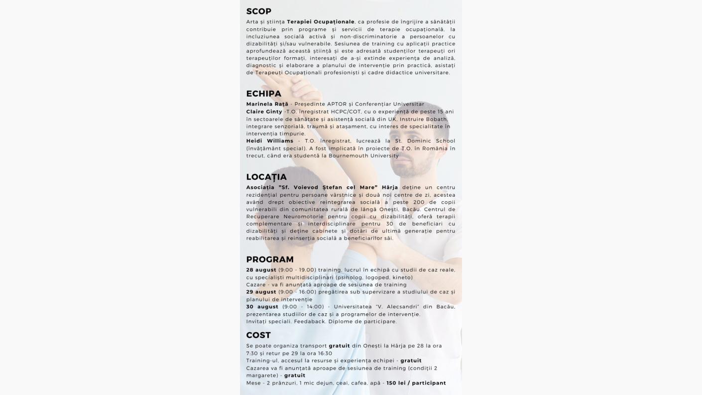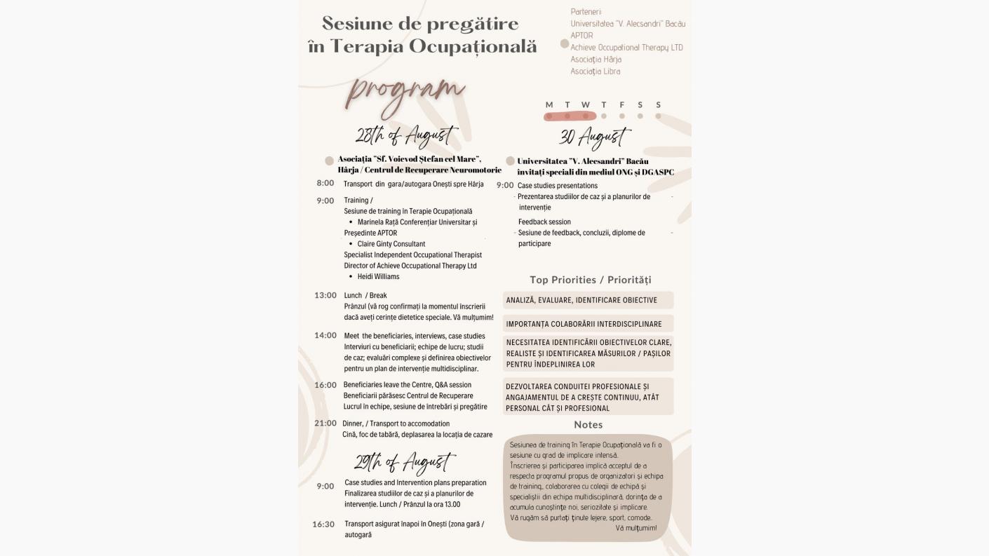 Asociația ”Sfântul Voievod Ștefan cel Mare”, în parteneriat cu Universitatea "Vasile Alecsandri" din Bacău, Asociația Profesională a Terapeuților Ocupaționali din România (APTOR), Asociația Libra și Achieve - Occupational Therapy Ltd din Marea Britanie, organizează o sesiune de training și practică intensivă în perioada 28 - 30 august, cu studenți și terapeuți de terapie ocupațională, pentru dezvoltarea capabilității de evaluare, planificare, implementare plan de intervenție, precum și importanța complementarității terapiilor de intervenție în cazul copiilor și tinerilor cu dizabilități din România.