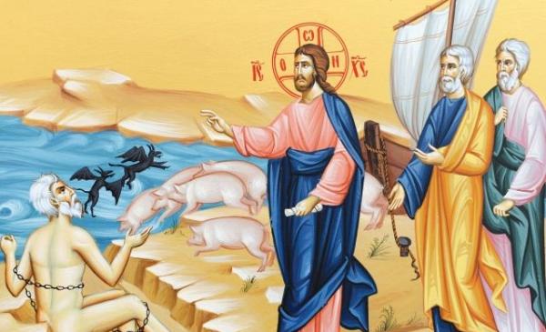 Plecând Domnul peste ape, lăsând pe galileeni, Ajunge pe ţărmul mării din ţinutul Ghergheseni. Abia atingând uscatul, întâlneşte pe un om, Ce...