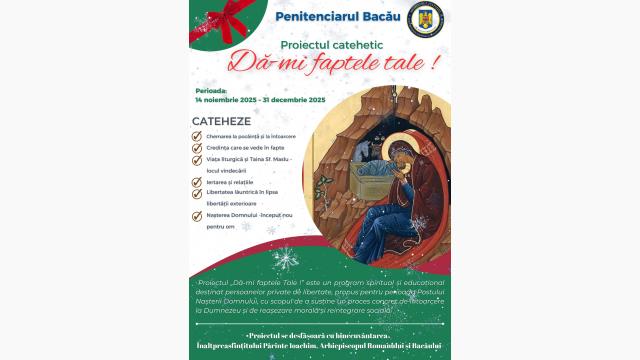 În perioada Postului Nașterii Domnului, între 14 noiembrie 2025 și 31 decembrie 2025, la Penitenciarul Bacău se derulează proiectul catehetic „Dă-mi faptele tale!”, un program spiritual și educațional adresat persoanelor private de libertate, centrat pe redescoperirea credinței și pe asumarea responsabilă a propriilor fapte. Proiectul se desfășoară cu binecuvântarea Înaltpreasfințitului Părinte Ioachim, Arhiepiscopul Romanului și Bacăului, iar activitățile religioase sunt coordonate de pr. Daniel Marari, preot colaborator extern și delegatul Înaltpreasfinției Sale pentru activitatea pastoral-misionară din Penitenciarul Bacău. Derularea proiectului este posibilă datorită sprijinului conducerii Penitenciarului Bacău, reprezentată de domnul comisar-șef de poliție penitenciară Viorel Marcel Voicu, director al Penitenciarului Bacău, alături de colaboratorii săi.