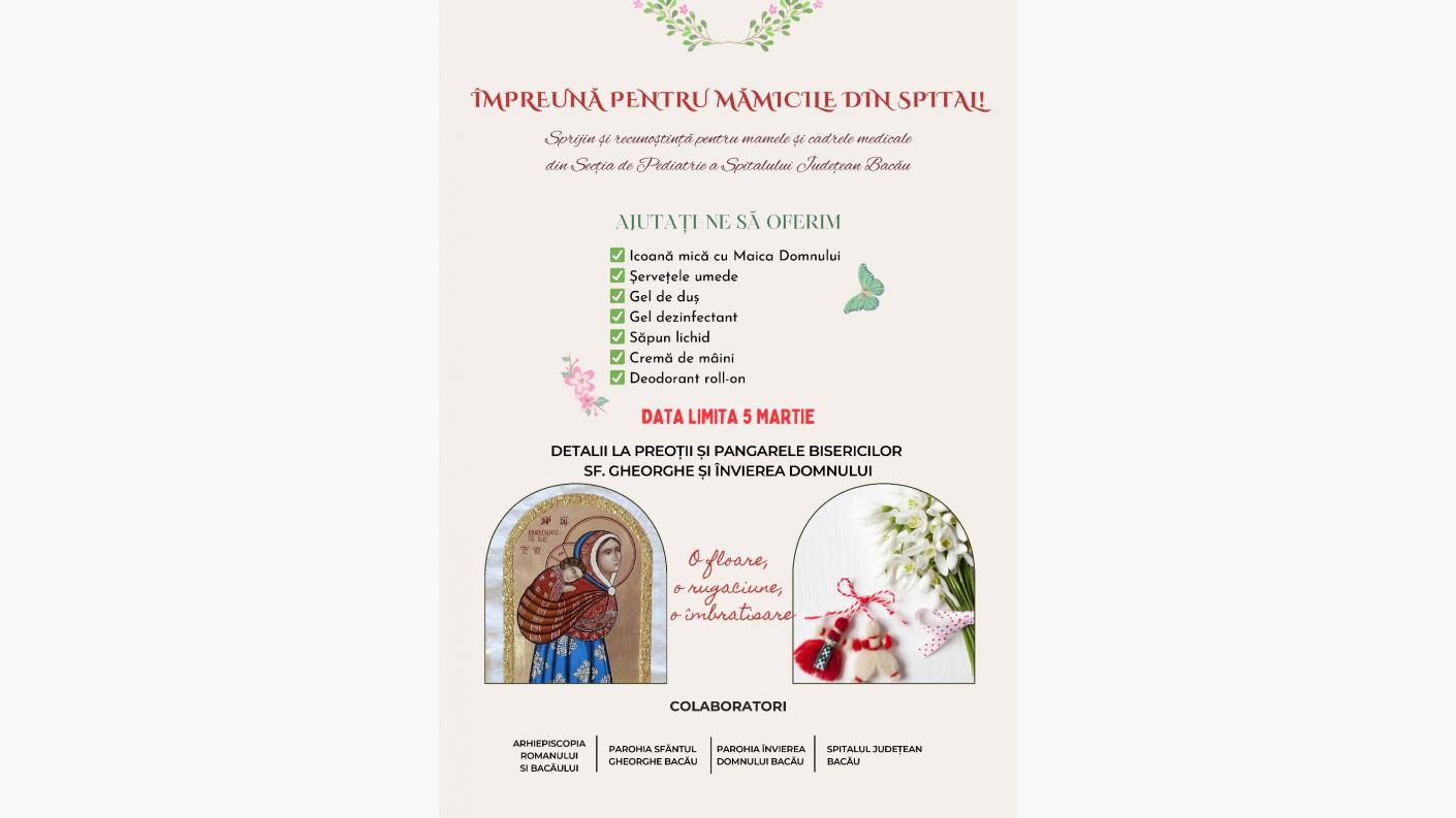 Marcând Luna pentru Viață, cu ocazia Zilei Internaționale a Femeii, Parohiile "Sf. Gheorghe" și "Învierea Domnului" din Bacău au organizat o acțiune dedicată mamelor care își veghează copiii internați la Secția de Pediatrie a Spitalului Județean de Urgență Bacău, precum și personalului sanitar și auxiliar feminin din această secție.