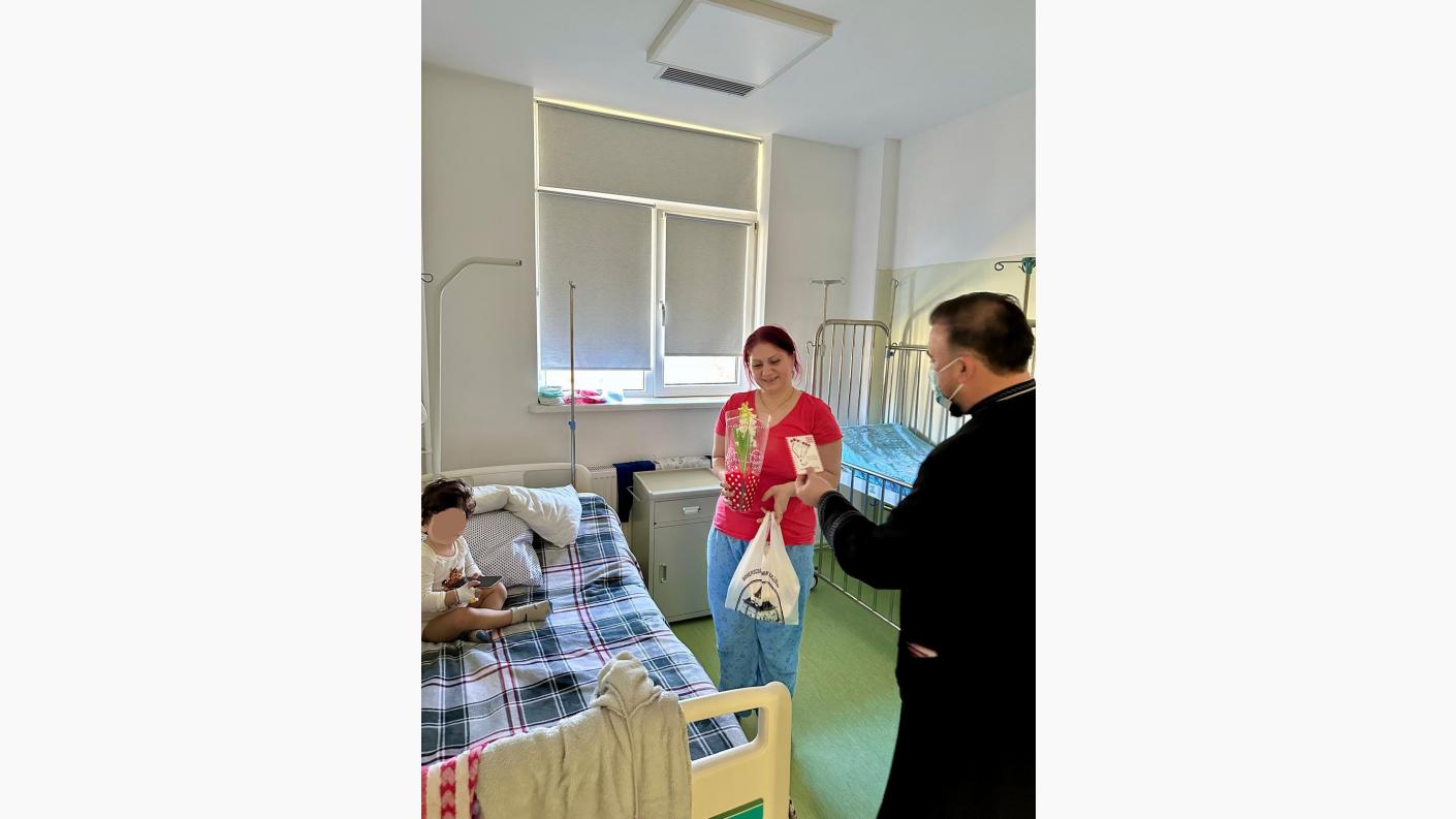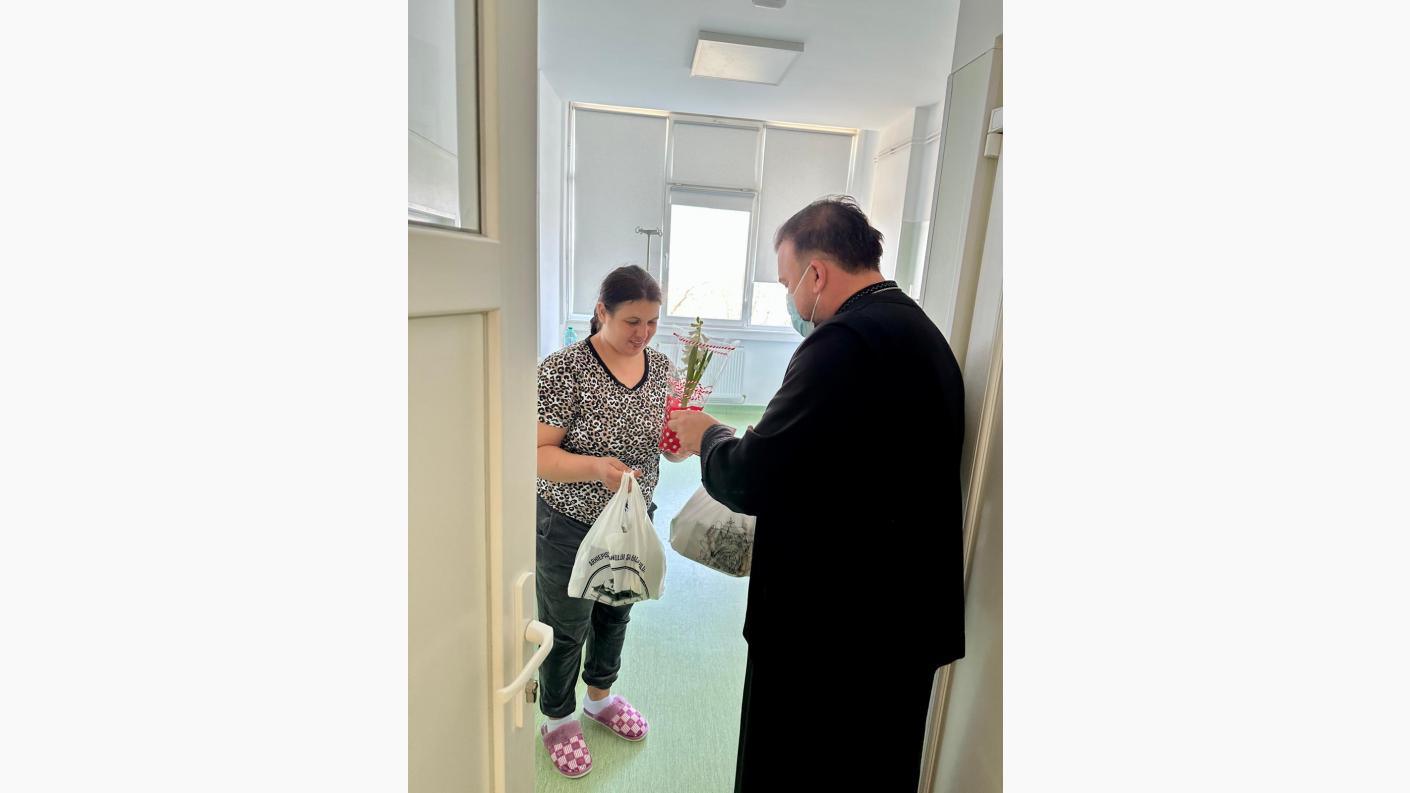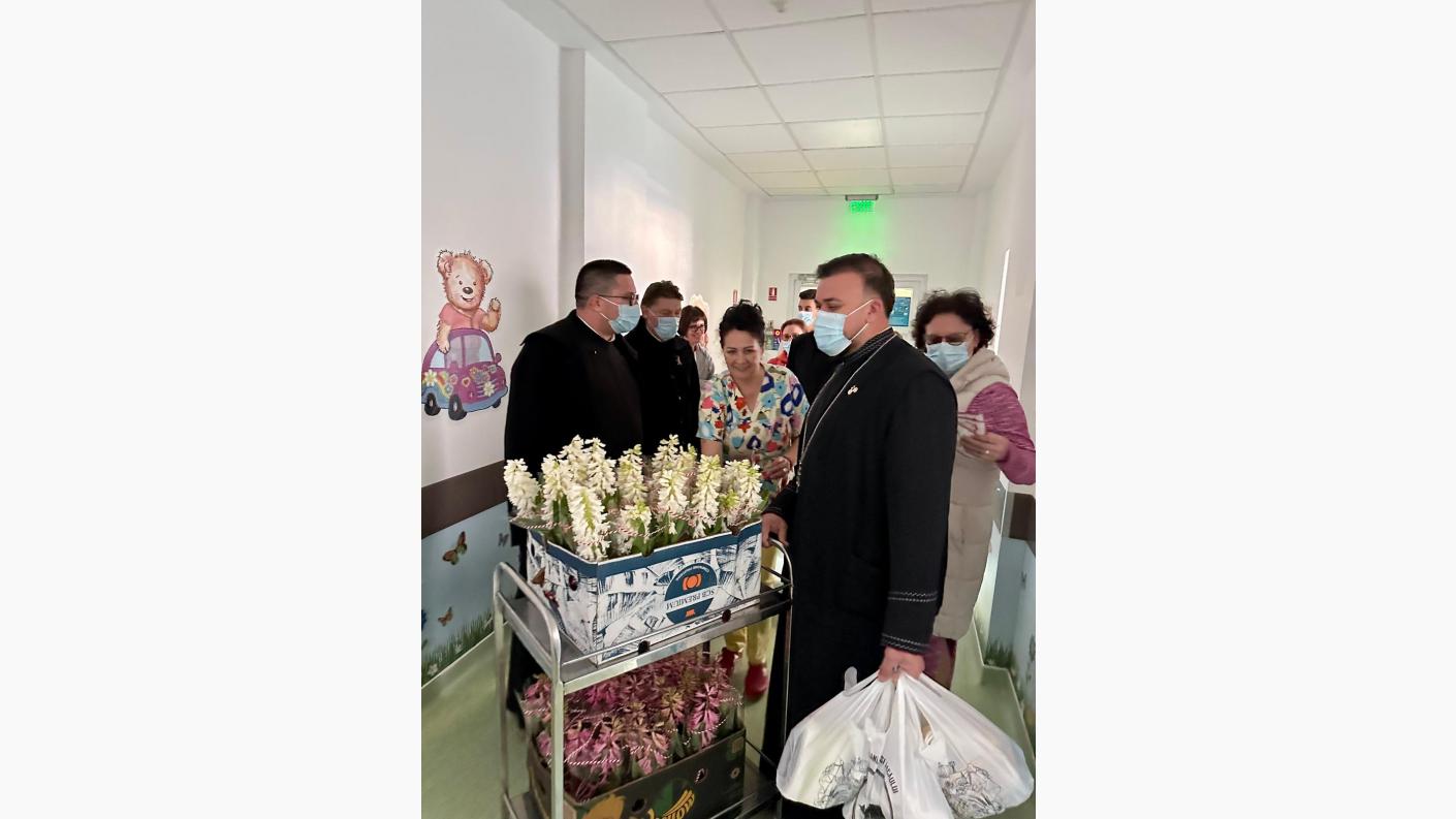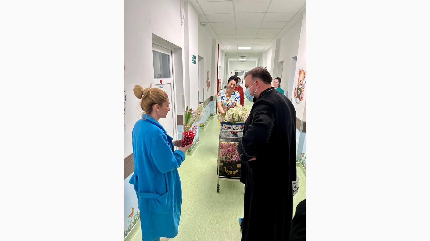 |Cu binecuvântarea Înaltpreasfințitului Părinte Ioachim, preoți din cele două parohii au oferit 20 de pachete cu produse de îngrijire și icoane mamelor aflate alături de copiii lor, precum și flori și mărțișoare pentru toate angajatele secției. În total, 60 de persoane au fost beneficiare ale acestui gest de apreciere și solidaritate.
