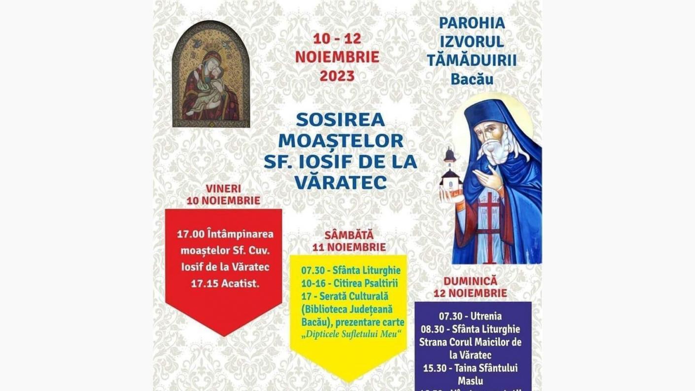 Vineri, 10 noiembrie 2023, la Parohia „Izvorul Tămăduirii” din Bacău a debutat programul zilelor duhovnicești ale parohiei, cu prilejul venirii raclei cu sfintele moaște ale Sfântului Iosif de la Văratec. La ceas de seară, după săvârșirea Tainei Sfântului Maslu, un sobor de preoți coordonat de către părintele protoiereu Eugen-Ciprian Ciuche a întâmpinat delegația de maici a Mănăstirii Văratec, condusă de stavrofora Iosefina Giosanu, stareța obștii nemțene, care au adus în glas de rugăciune racla cu sfântul odor.