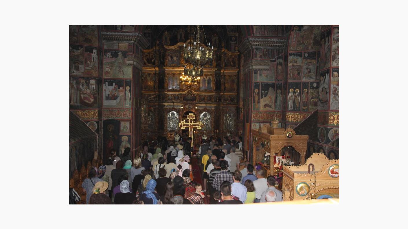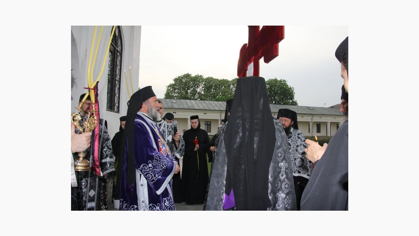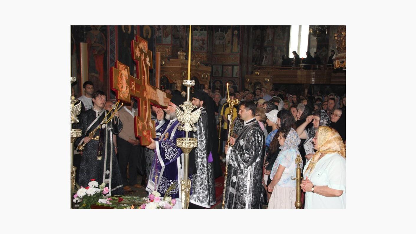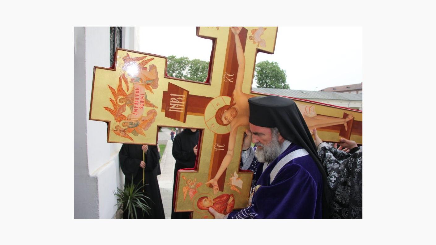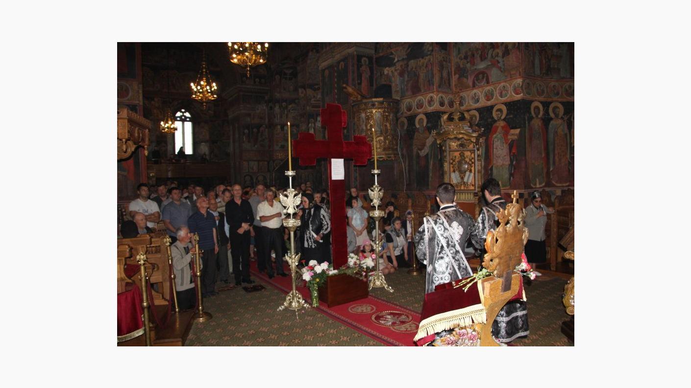 În timpul Deniei, în dangătul clopotului, Sfânta Cruce pe care este pictată răstignirea Mântuitorului Iisus Hristos a fost purtată pe umeri în jurul sfântului locaș, după care Preasfinţitul Părinte Ioachim a adus-o în mijlocul bisericii spre închinarea credincioșilor.