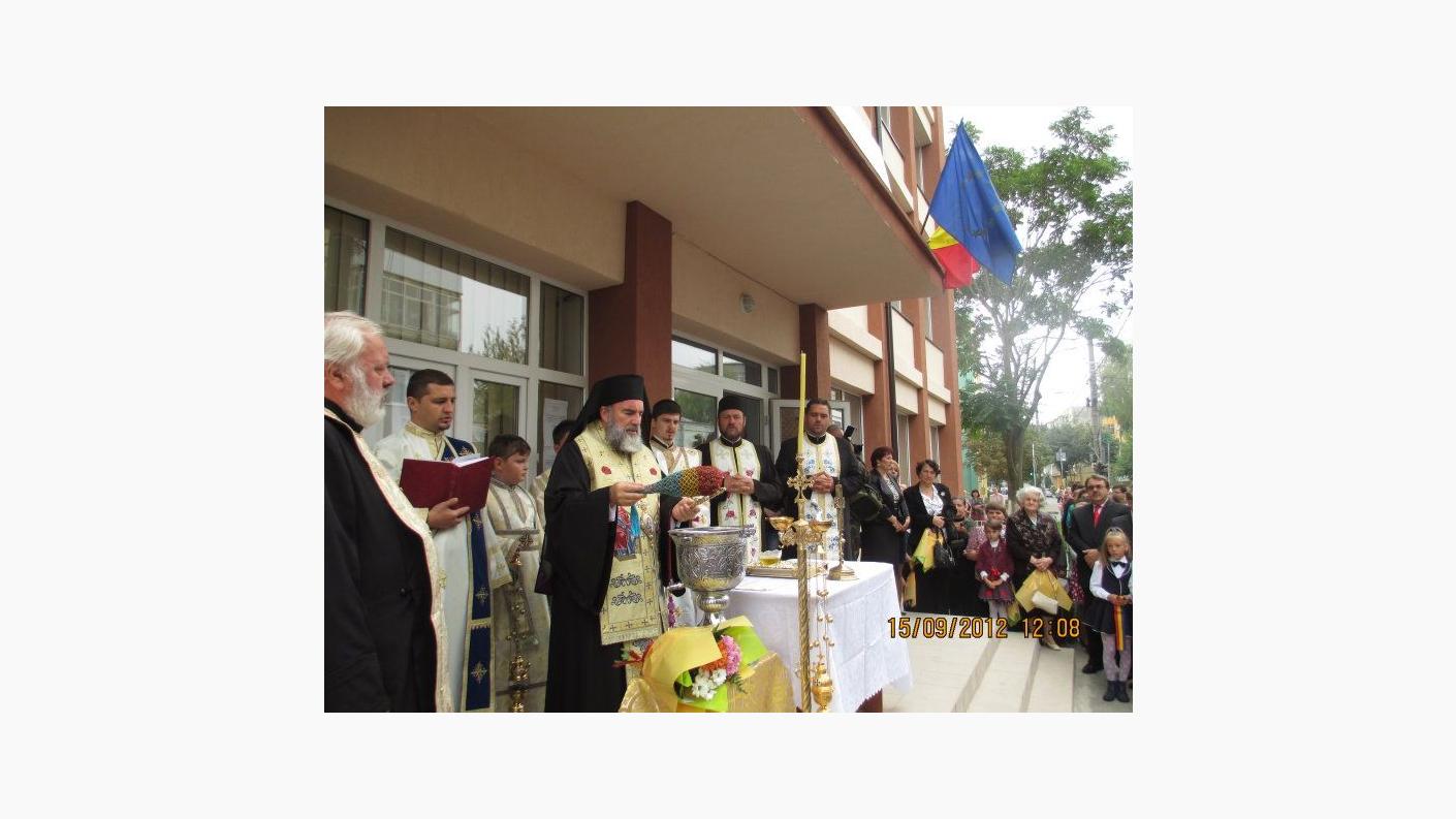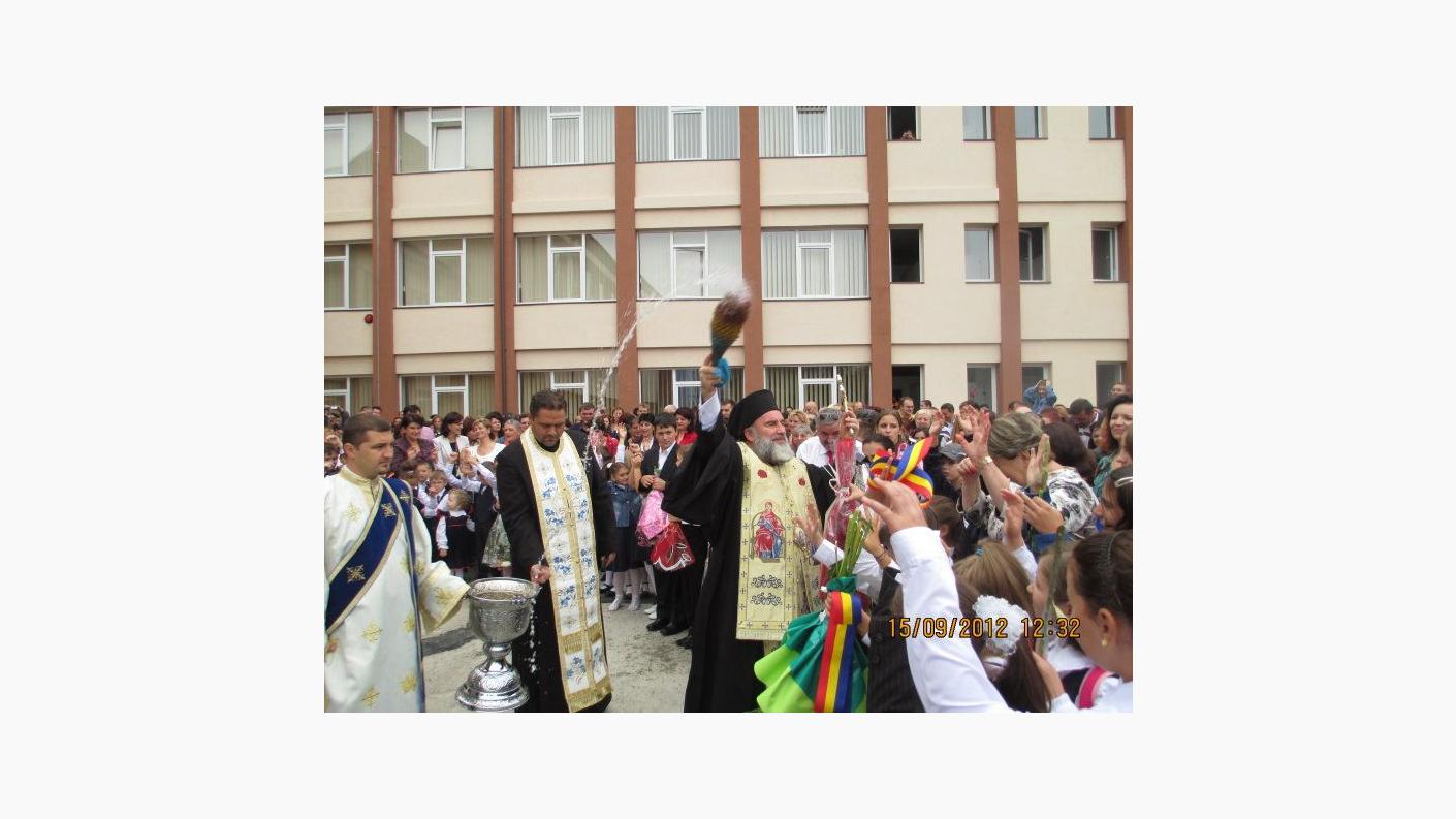 Preasfintitul Ioachim a stropit cu aghiazma multimea credinciosilor prezenti,oferind tuturor cate o iconita sfintita, apoi a adresat un cuvant ocazional, de binecuvantare a noului an scolar. In cuvantul sau, Preasfintitul a indemnat pe dascalii scolii sa fie adevarati "formatori de ingeri" si modelatori ai tinerei generatii, oferind un dar simbolic Scolii: Icoana Sf. Cuvioase Parascheva - ocrotitoarea Romanului si o Biblie , Cartea Cartilor, pentru Biblioteca Scolii.