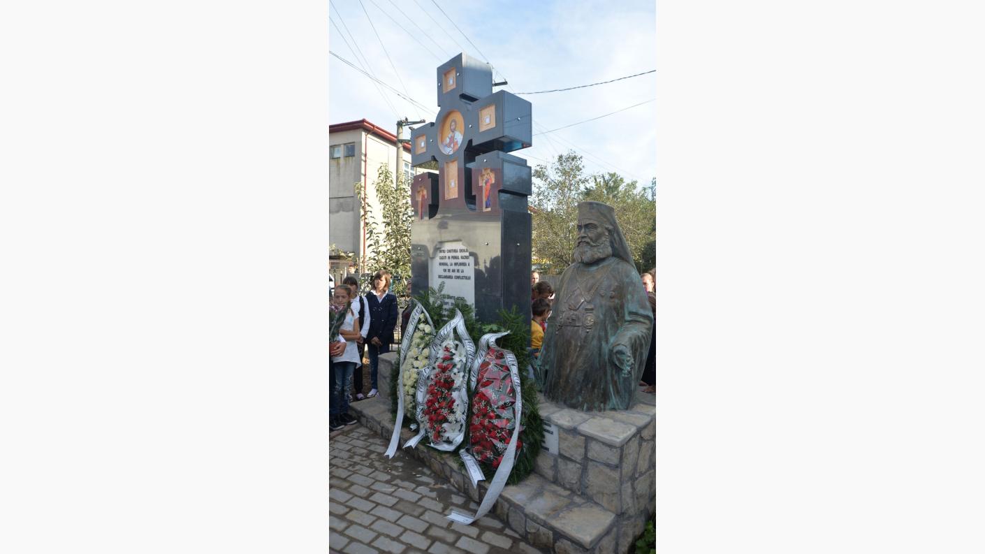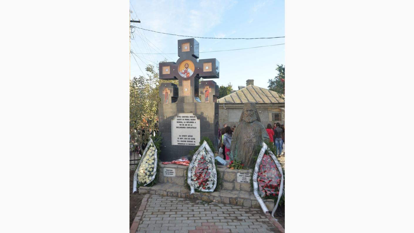 Preasfinţitul Părinte Ioachim Băcăuanul a fost prezent joi, 25 septembrie, în mijlocul credincioșilor din Sascut pentru a binecuvânta lucrările unui ansamblu comemorativ închinat eroilor care s-au jertfit în Primul Război Mondial. Momentul, la care au fost prezenți numeroși credincioși din zona Sascutului, a constituit un adevărat eveniment, întrucât, cu același prilej a fost dezvelit și bustul episcopului Teodosie Atanasiu, personalitate marcantă a vieții bisericești de la începutul secolului al XX-lea. "Ansamblul a fost ridicat în curtea Protopopiatului Sascut şi constă dintr-o cruce de granit negru cu o înălţime de 3,5 metri. Alături de cruce a fost aşezat bustul episcopului Teodosie Atanasiu originar din Sascut, episcop al Romanului în perioada 1912-1923, perioadă în care a avut loc şi Primul Război Mondial. Episcopul Teodosie s-a remarcat în perioada războiului, în special prin epistolele de încurajare adresate ostaşilor români de pe front. De asemenea, ierarhul s-a remarcat prin colectele organizate în vederea sprijinirii ostaşilor pe de front. Ne-am bucurat de faptul că Preasfinţitul Părinte Ioachim Băcăuanul, alături de soborul slujitorilor, a sfinţit ansamblul comemorativ. Au fost prezente autorităţi locale, reprezentanţi ai Asociaţiei «Cultul Eroilor» - Bacău, profesori şi elevi din zona Sascutului", a spus pr. Ioan Negoiţă, protopop al Protopopiatului Sascut.