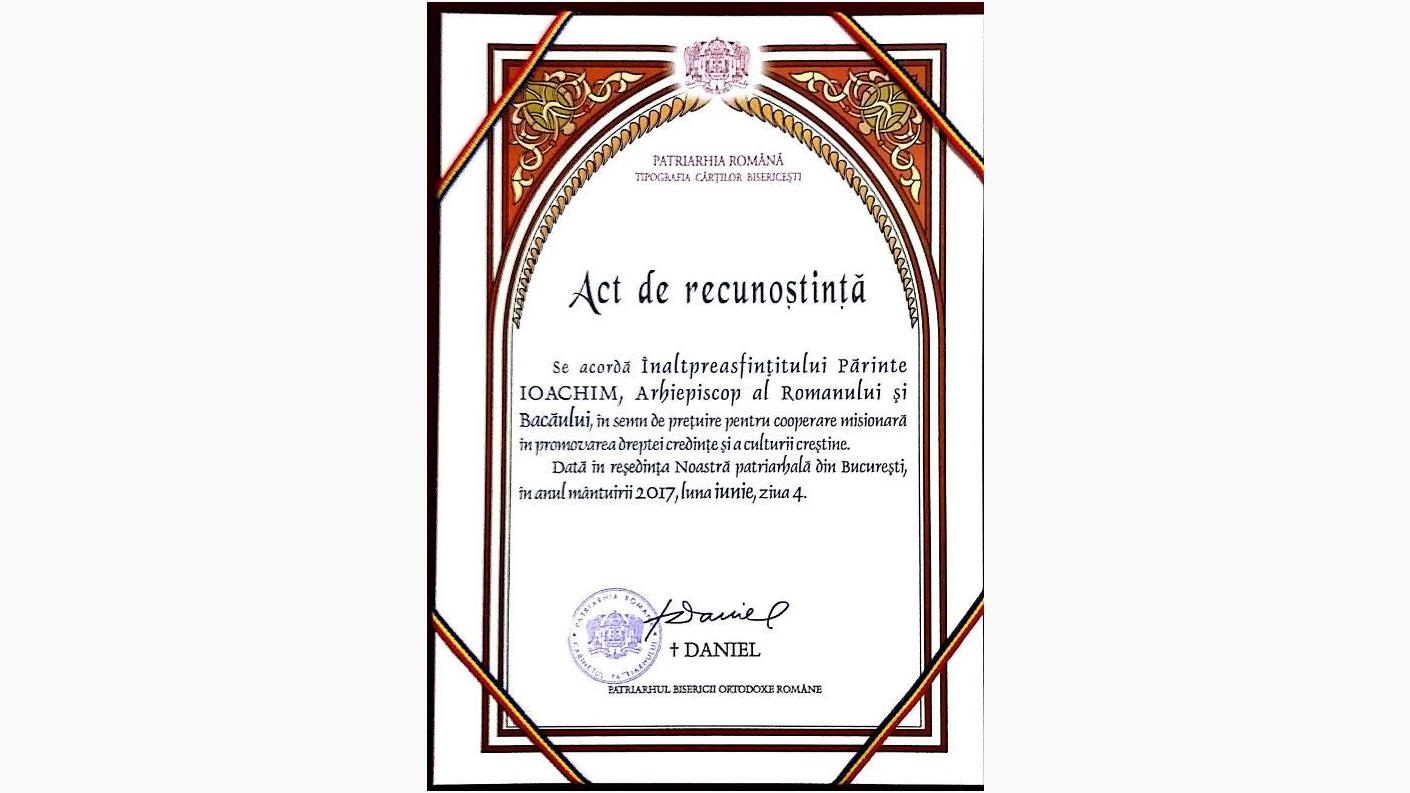 În cadrul ședinței de lucru a Sfântului Sinod al Bisericii Ortodoxe Române, din zilele de 4 și 5 iulie 2017, desfășurată în Sala Sinodală din Reședința Patriarhală, sub președinția Preafericitului Părinte Patriarh Daniel, Înaltpreasfințitul Părinte Ioachim a primit din partea Preafericirii Sale o distincție de recunoștință în semn de prețuire pentru cooperare misionară în promovarea dreptei credințe și a culturii creștine.