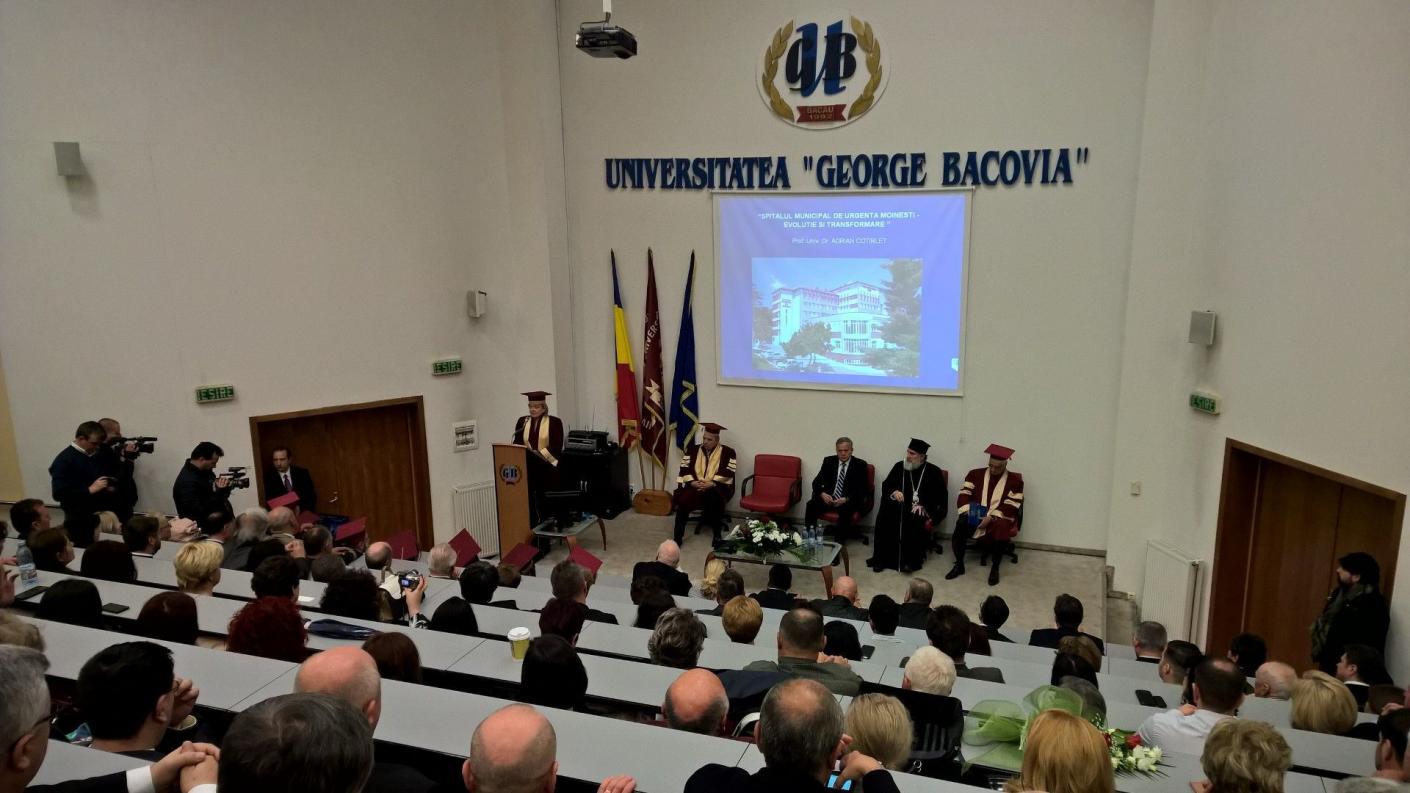 Personalități ale vieții universitare și culturale băcăuane, alături de Înaltpreasfințitul Părinte Arhiepiscop Ioachim, dar și reprezentanți ai celor mai importante instituții publice și private din județ, au participat în data de 20 aprilie, în aula ”Moldova” a Universității ”George Bacovia”, la festivitatea de decernare a titlului de Doctor Honoris Causa prof. univ. dr. Adrian Cotârleț. Distinsul medic și profesor, care este și membru în Adunarea Națională Bisericească, reprezentând Eparhia Romanului și Bacăului, a fost răsplătit pentru contribuția sa în dezvoltarea științei și practicii medicale, ca simbol al recunoașterii valorii profesionale, manageriale și academice, pentru întreaga activitate științifică și aplicativă în domeniul medical, dar și pentru rezultatele de excepție în managementul sanitar.