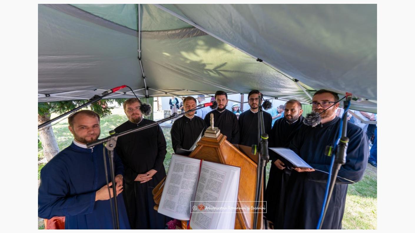 Răspunsurile la strană au fost date de corul „Diaconia” al Catedralei arhiepiscopale „Sf. Cuvioasă Parascheva” din Roman.