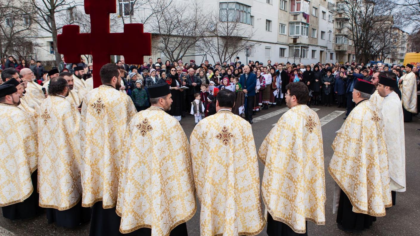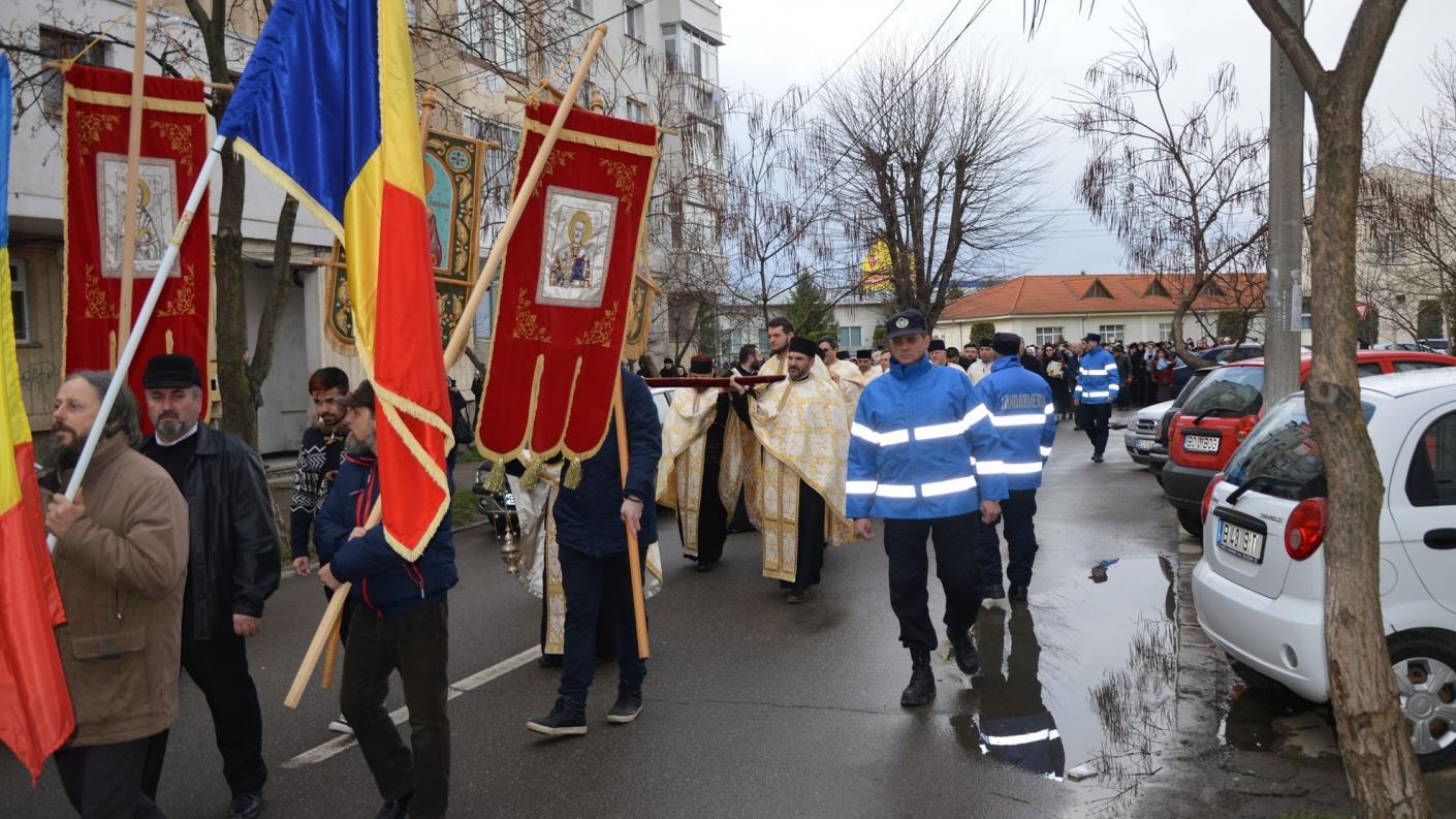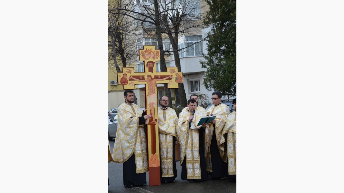 Mulțimea creștinilor a pornit în procesiune cu Sfânta Cruce însoțiți de tineri ce au interpretat cântări religioase și au purtat steagurile eparhiei și tricolore. Odată ajunși în fața bisericii „Sfinții Trei Ierarhi”, IPS Părinte Arhiepiscop Ioachim a binecuvântat pelerinii participanți și a purtat Sfânta Cruce, pe care personal a așezat-o în Sfânta Biserică, după care a înălțat rugăciuni și a rostit un cuvânt de învăţătură:
