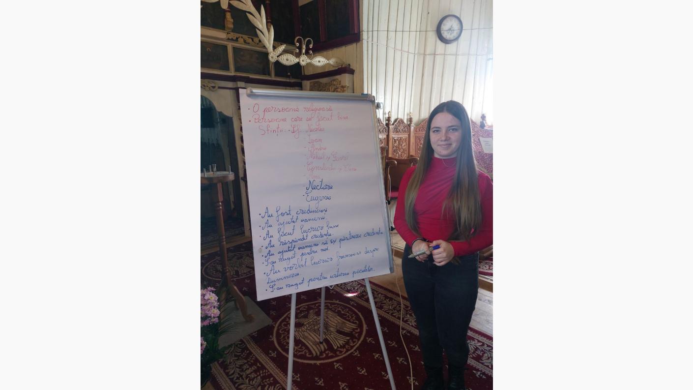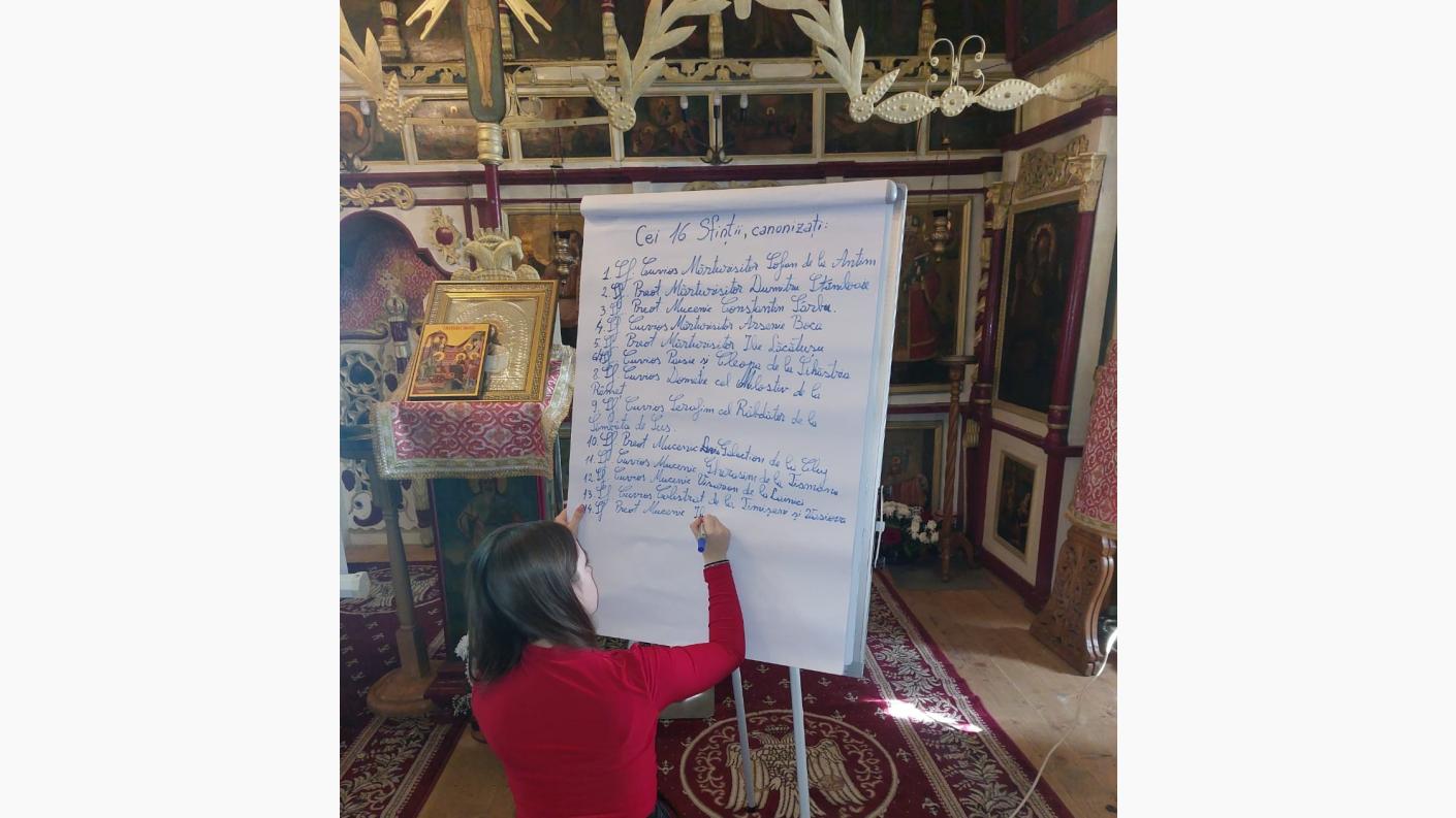 După anunțarea temei, copiii au făcut cunoștință cu cei 16 sfinți recent canonizați, adică au urmărit un material video de prezentare generală a lor. Dintre aceștia au fost aleși trei sfinți ale căror vieți au fost prezentate mai în detaliu, respectiv Sfântul Cuvios Cleopa de la Sihăstria, Sfântul Cuvios Mucenic Gherasim de la Tismana și Sfântul Cuvios Mărturisitor Arsenie de la Prislop, întrucât doi dintre ei sunt mai cunoscuți de copii, iar Sfântul Gherasim este născut pe meleaguri băcăuane, în comuna Poduri. Copiii au urmărit materiale video despre aceste personalități, li s-a povestit viața lor, iar unii dintre copii au povestit despre ce cunoșteau ei despre acești sfinți. Au asociat numărul 16 ca fiind 1 și 6, care împreună dau 7, numărul Darurilor Sfântului Duh.