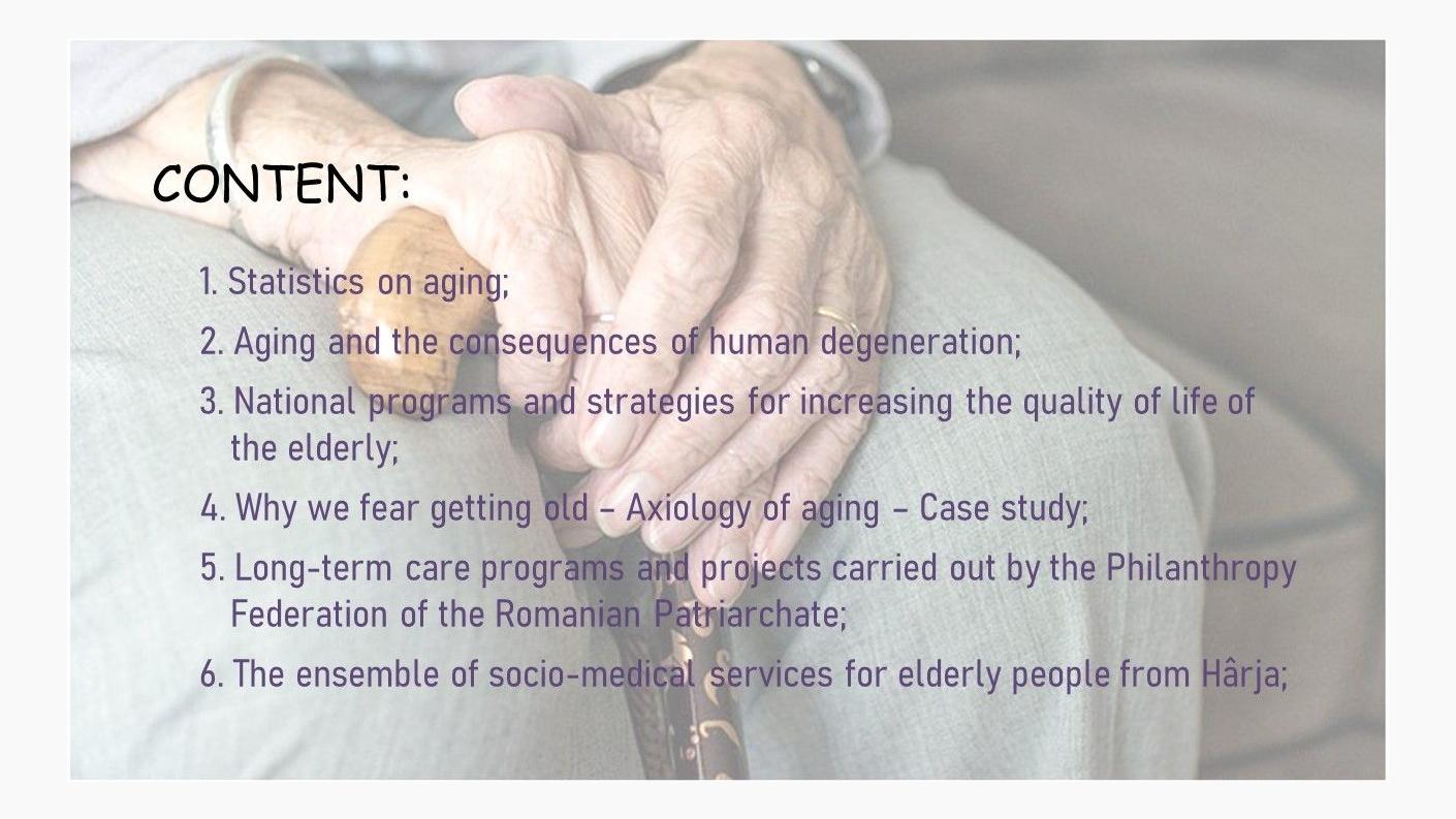 În cadrul acestui eveniment , mai mulți membri ai Federației au luat cuvântul cu privire la problematica propusă și au prezentat situații reale cu privire la îngrijirea vârstnicilor din România, precum și aportul adus de către Biserică în crearea de centre și servicii care să deservească persoanei aflate la vârsta a III-a. Au fost conferențiari si din rândul comisarilor europeni, membri ai comisiilor de incluziune si protecție socială, care au prezentat politicile europene in domeniul îngrijirii de lungă durată, apreciind implicarea Bisericii Ortodoxe Române in creșterea calității vieții persoanelor vârstnice in țara noastră si diaspora. În cadrul acestor zile a existat și o serie de întrebări și răspunsuri, prilej cu care cei interesați au putut afla lămuriri cu privire la programele alcătuite pentru vârstnici care sunt sau urmează a fi implementate pe teritoriul României.
