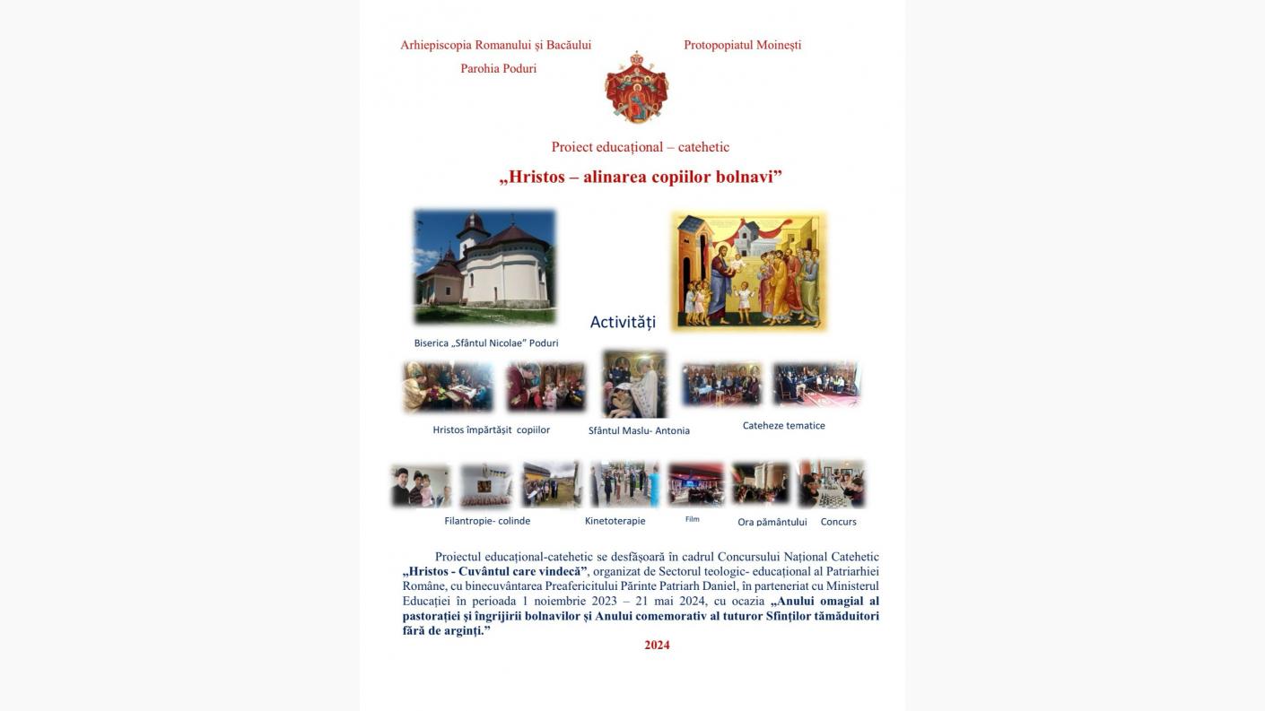 Astfel, joi 18 aprilie 2024, la sediul Protopopiatului Moinești, a fost organizată selecția acestor proiecte catehetice, care au fost depuse de către o parte dintre parohiile arondate protopopiatului. Comisia alcătuită din părintele protopop Costel Mareș, părintele Codrin Laslău, responsabilul catehetic și părintele Costel Popa, profesor de religie, a analizat toate planurile depuse iar în urma dezbaterilor a fost selectat Proiectul Parohiei Poduri: ,,Hristos - alinarea copiilor bolnavi”. Acest proiect a trecut de etapa zonală și va merge către evaluarea efectuată la Centrul Eparhial de la Roman, iar de aici va urma transmiterea proiectului câştigător către Sectorul teologic-educațional al Patriarhiei Române.