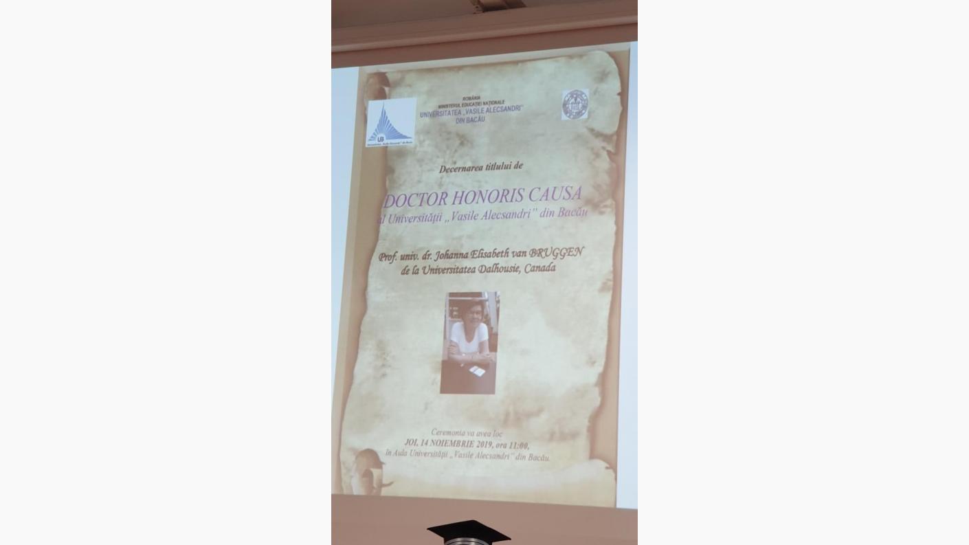 La Universitatea „Vasile Alecsandri” din Bacău, a avut loc joi, 14 noiembrie, decernarea titlulului de Doctor Honoris Causa, doamnei prof.univ. dr. Hanneke van Bruggen, de la Universitatea Dalhousie din Canada, ca recunoaștere a contribuției determinante pe care a avut-o în demersurile pentru pregătirea și implementarea specializării de „Terapie Ocupațională” în țara noastră.