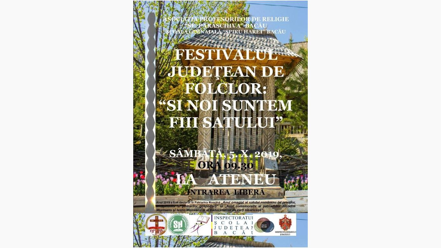 Cu binecuvântarea Înaltpreasfințitului Părinte Ioachim, Arhiepiscopul Romanului și Bacăului, în prezenţa părintelui profesor Adrian Alexandrescu, inspector pentru disciplina Religie în cadrul Inspectoratului Şcolar Judeţean Bacău, sâmbătă, 5 octombrie 2019, de Ziua Internațională a Educației, sub patronajul Asociației Profesorilor de Religie “Sfânta Parascheva” Bacău, a fost organizat Festivalul de folclor “Și noi suntem fiii satului”, activitate de celebrare a tradiţiilor satului în contextul Anului omagial al satului românesc (al preoților, învățătorilor și primarilor gospodari).