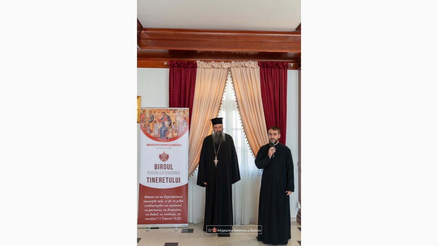 „Astăzi, la Centrul Eparhial de la Roman este o zi a bucuriei, a tinereții și a excelenței. După ce ne-am întâlnit în rugăciune în Catedrala Arhiepiscopală închinată Sfintei Parascheva, pentru a mulțumi tinerilor și formatorilor lor care s-au ostenit timp de șase luni de zile în fiecare parohie pentru implementarea Concursului Național Catehetic de anul acesta, ne aflăm în sala închinată Sf. Ierarh Dosoftei pentru cea de-a doua parte a evenimentului de astăzi, care presupune premierea celor 15 proiecte câștigătoare ale fazei eparhiale. Luna mai, prin evenimentele care se desfășoară în perioada aceasta, putem spune că are un caracter deosebit deoarece în zilele de 15 și 16 mai este omagiată personalitatea ilustrului ierarh Melchisedec Ștefănescu, iar cu prilejul acestui eveniment, cu binecuvântarea Înaltpreasfințitului Părinte Arhiepiscop Ioachim, de-a lungul a 25 de ani, întotdeauna sunt desfășurate numeroase activități religioase și culturale, printre care și activități catehetice. Anul acesta Concursul Național Catehetic reflectă tematica Anului omagial al Autocefaliei Bisericii Ortodoxe Române și a Centenarului Patriarhiei Române și Anului comemorativ al duhovnicilor și mărturisitorilor ortodocși români din secolul al XX-lea și s-a desfășurat de-a lungul a șase luni de zile, începând cu luna decembrie. În urma evaluării, am observat că au participat la acest concurs peste 1500 de tineri, ceea ce constituie un record pentru eparhia noastră”.