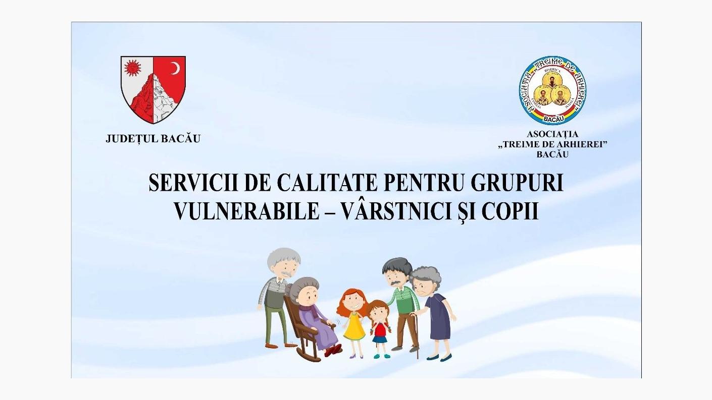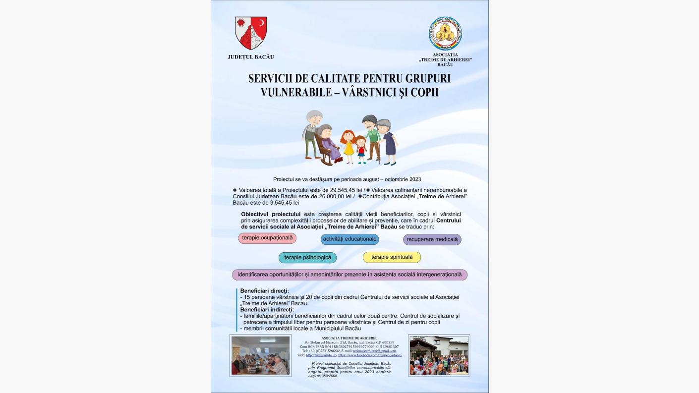 În urma sesiunii de evaluare și selectare a dosarelor de către Comisia de evaluare din cadrul Consiliului Județean Bacău, Asociaţia „Treime de Arhierei” Bacău a primit aviz favorabil implementării proiectului „Servicii de calitate pentru grupuri vulnerabile – vârstnici şi copii” și va primi finanțare nerambursabilă în valoare de 26.000,00 lei, Asociația „Treime de Arhierei” Bacău contribuind cu 3.545,45 de lei, valoarea totală a proiectului fiind de 29.545,45 lei.