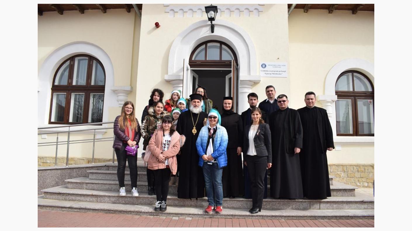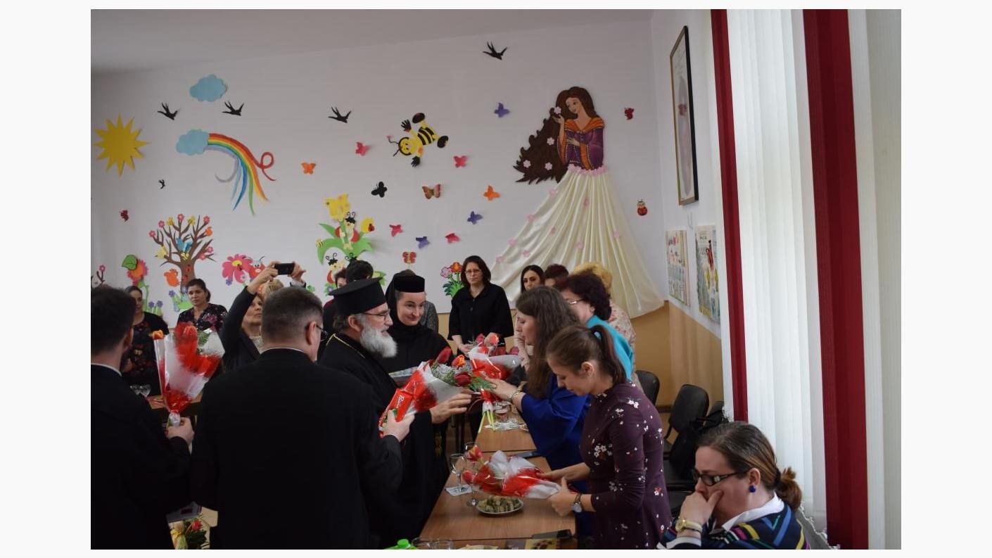 După ce a felicitat personalul Centrului eparhial de la Roman, IPS Părinte Arhiepiscop Ioachim, însoţit de către părintele Daniel Alexandru Zamfir (Consilier eparhial şi Purtător de cuvânt) şi părintele Valentin Băltoi (Consilier eparhial) a venit la „Grădina de Copii” din Parcul „Episcop Melchisedec”, situată în proximitatea Arhiepiscopiei, pentru a binecuvânta, a felicita şi a oferi flori tuturor angajatelor acestei instituţii.