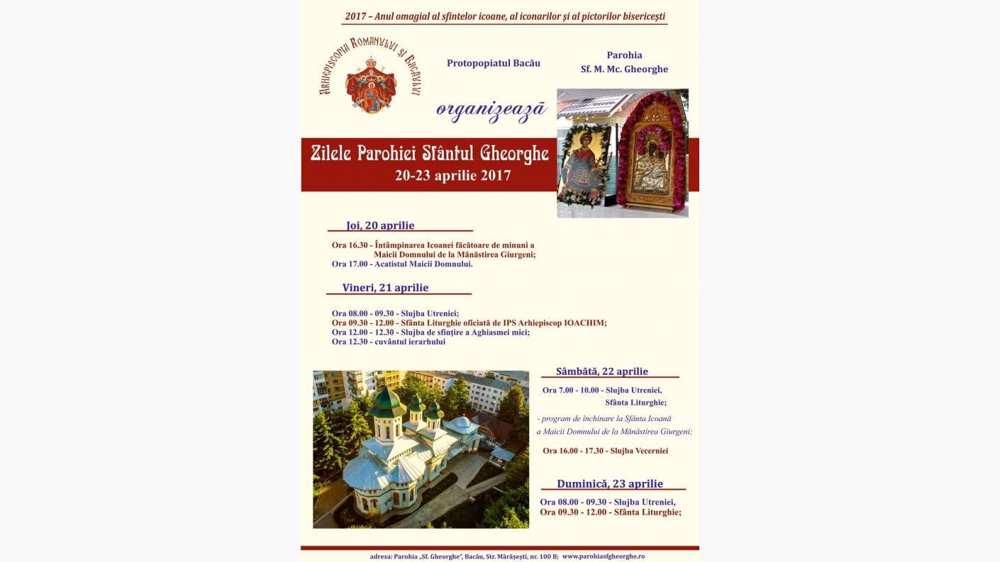 Zilele Parohiei „Sfântul Gheorghe” din Bacău au debutat și anul acesta cu aducerea icoanei Maicii Domnului de la Mănăstirea Giurgeni. După depunerea icoanei în biserică, de la ora 17.30, sub protia pr. protoiereu Costică Busuioc, s-a oficiat slujba Acatistului Preasfintei Născătoare de Dumnezeu, de către preoți din Protopopiatul Bacău și călugării ce însoțesc sfânta icoană.