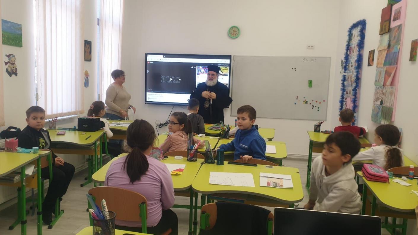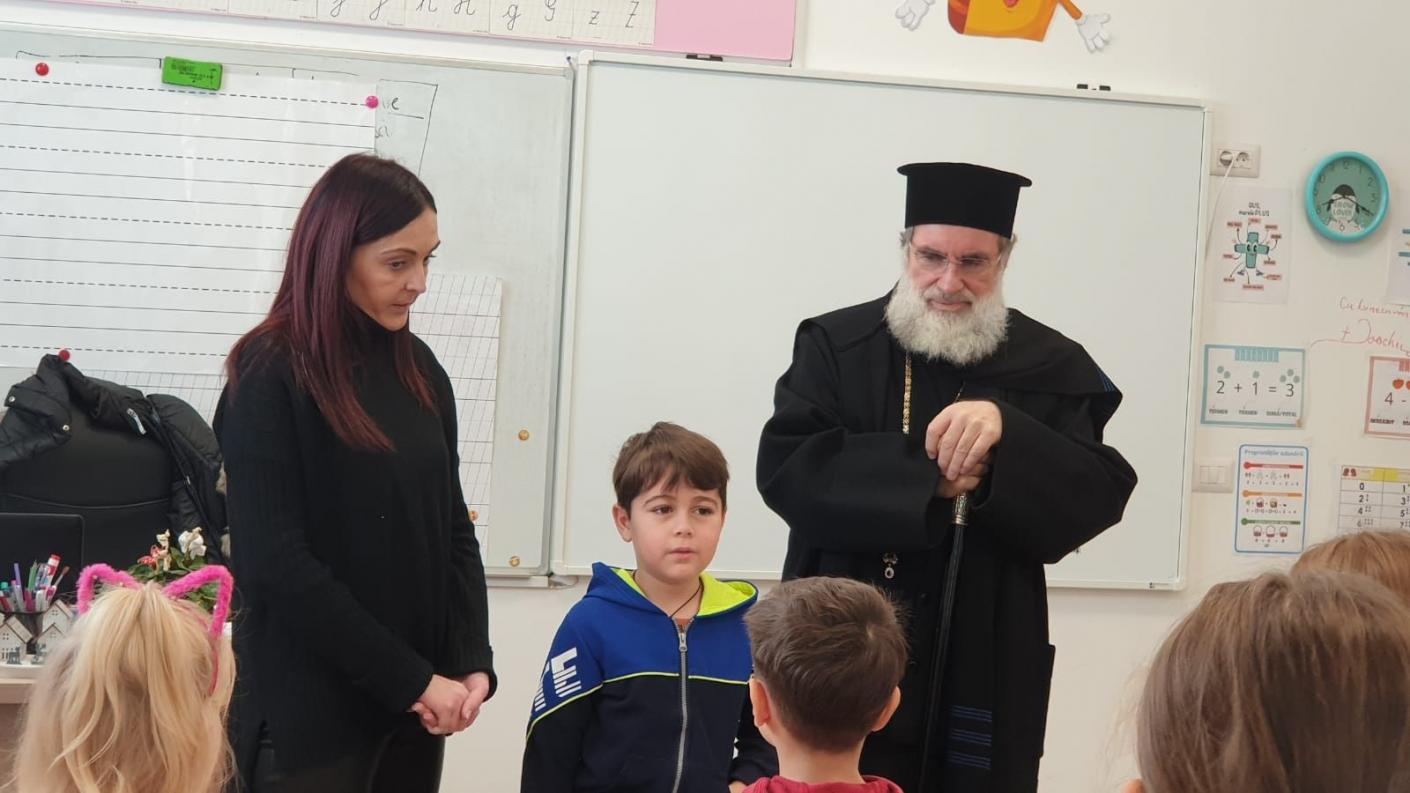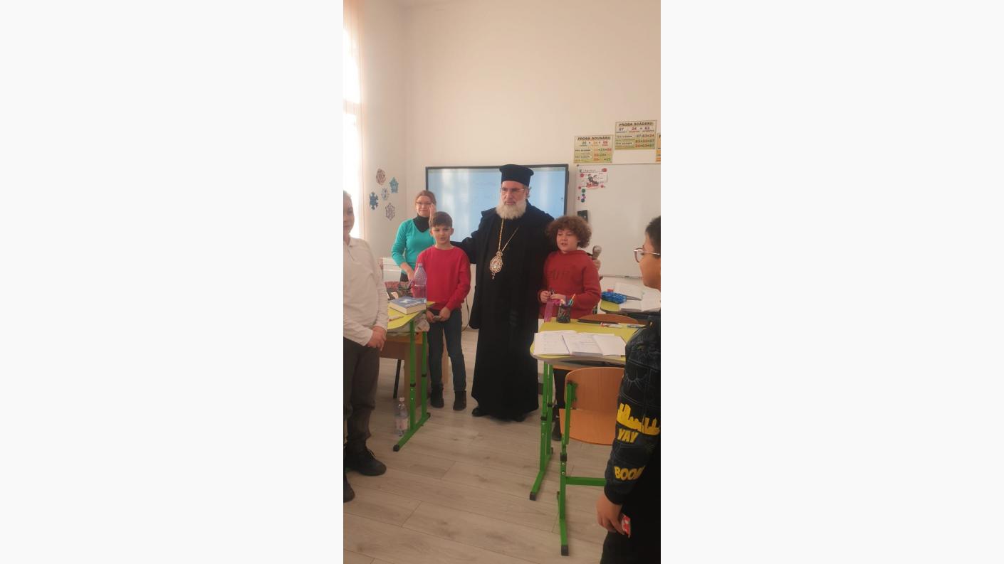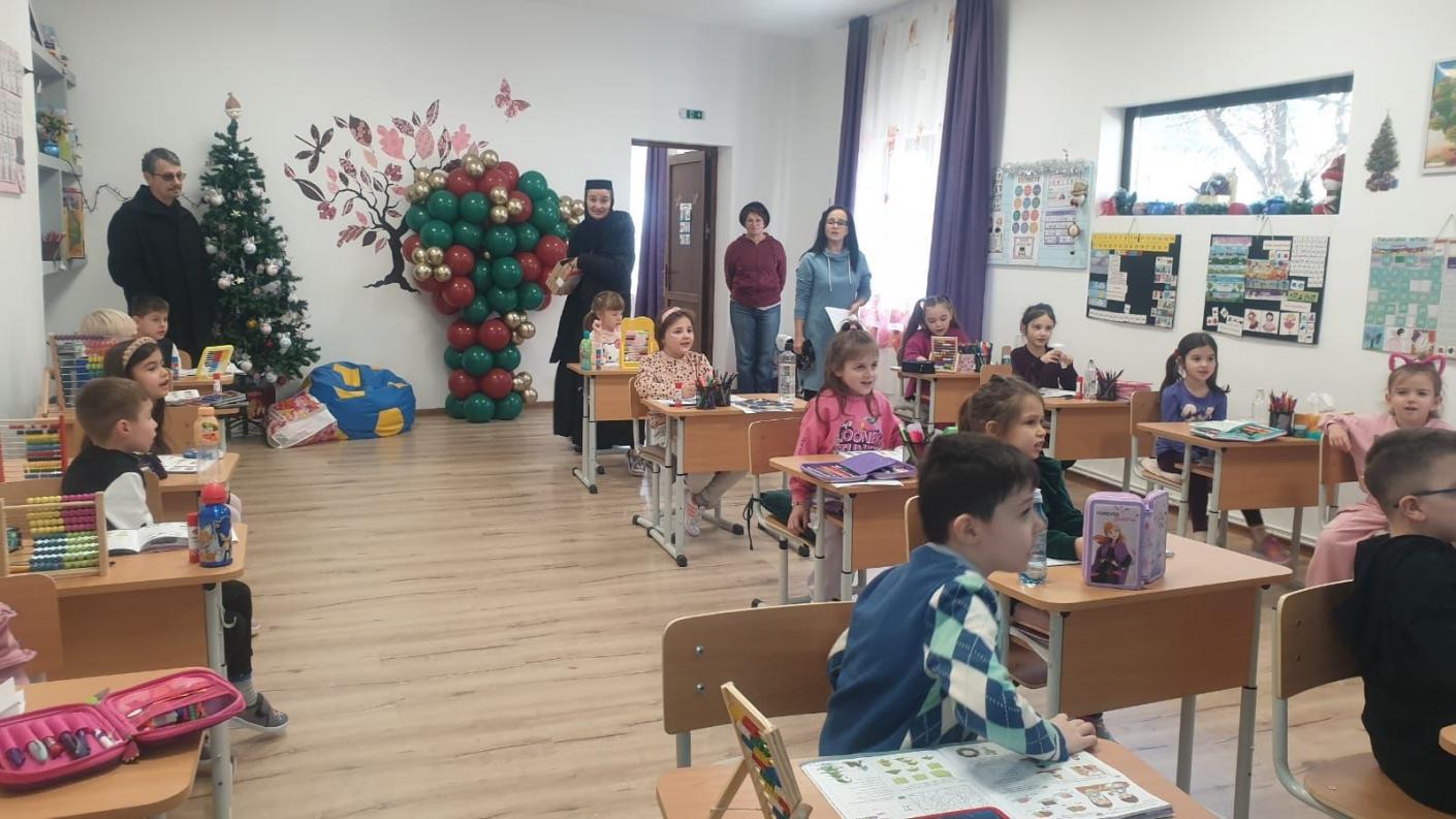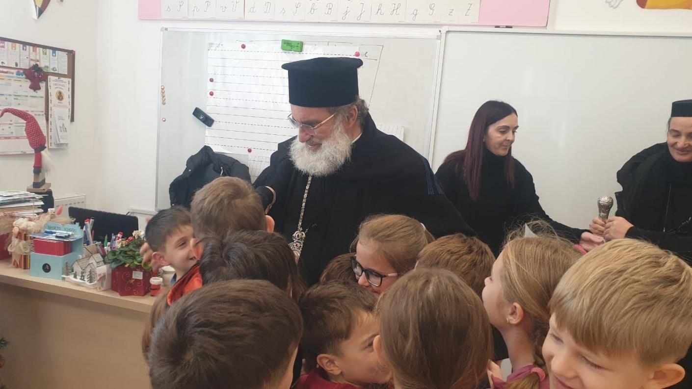 Într-o atmosferă de muncă asiduă a echipei de cadre didactice, dar și de bucurie, în preajma Praznicului Nașterii Domnului, ierarhul a ajuns în fiecare clasă de elevi, la cele patru de preșcolari și la cele patru de școlari, pentru a se întâlni personal cu fiecare copil, oferindu-le daruri și aprecierea Înaltpreasfinției Sale pentru rezultatele deosebite obținute la concursurile județene și naționale. În dar, fiecare clasă de elevi, atât cei din școala primară, cât și cei de la grădiniță, au interpretat colinde tradiționale și au povestit cu Înaltpreasfinția Sa aspecte legate de copilăria și nevoile lor.