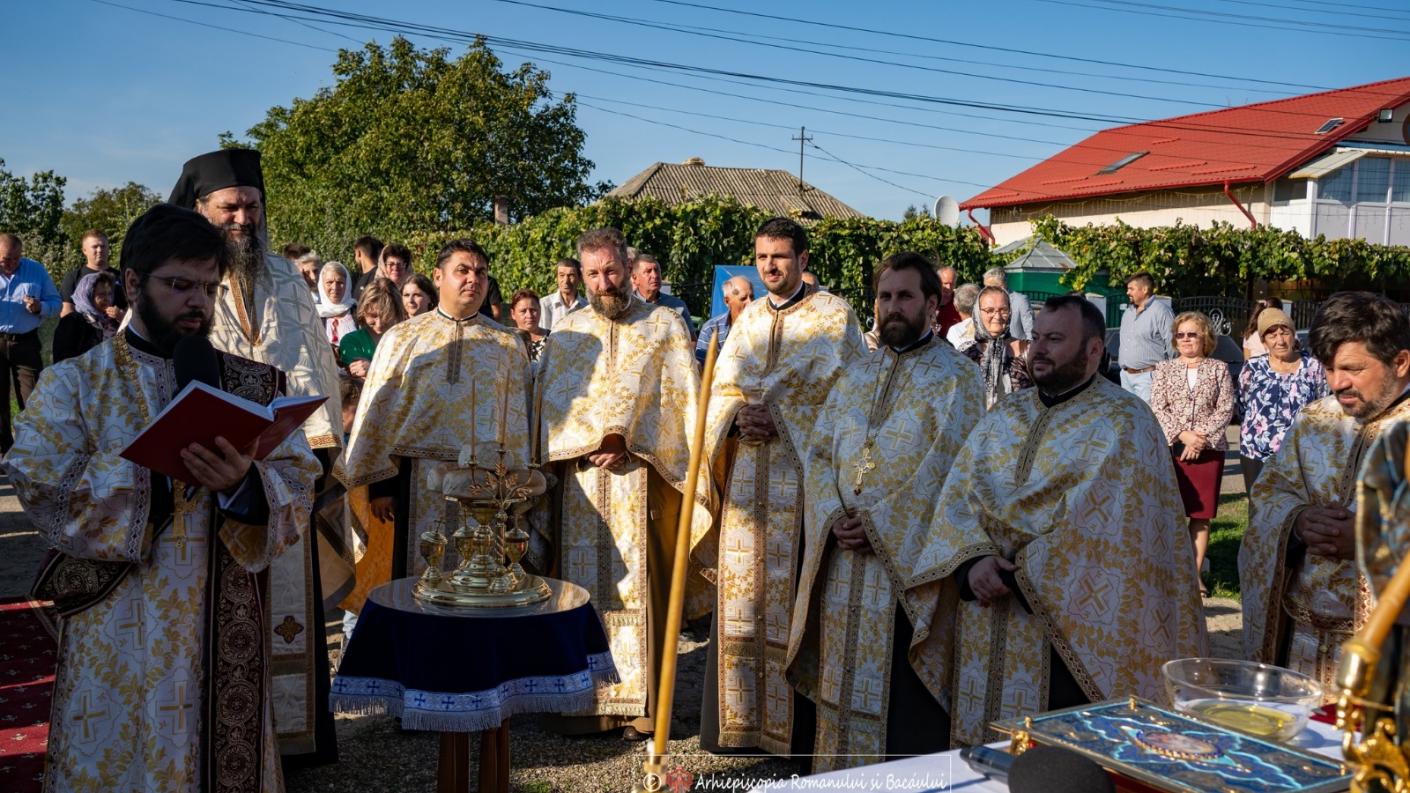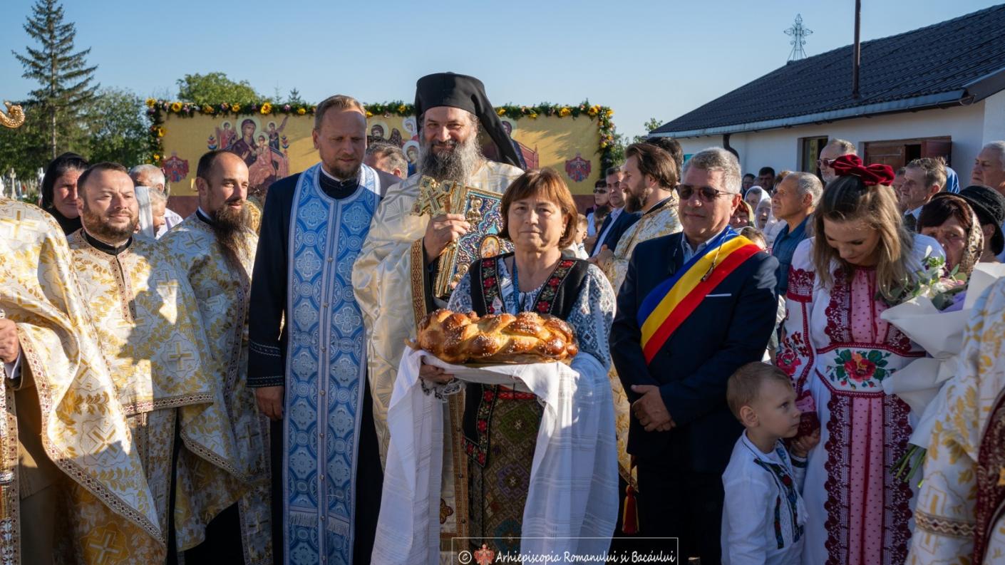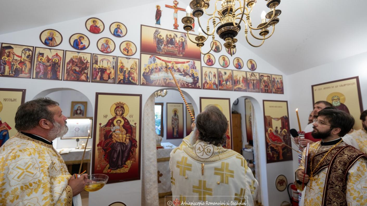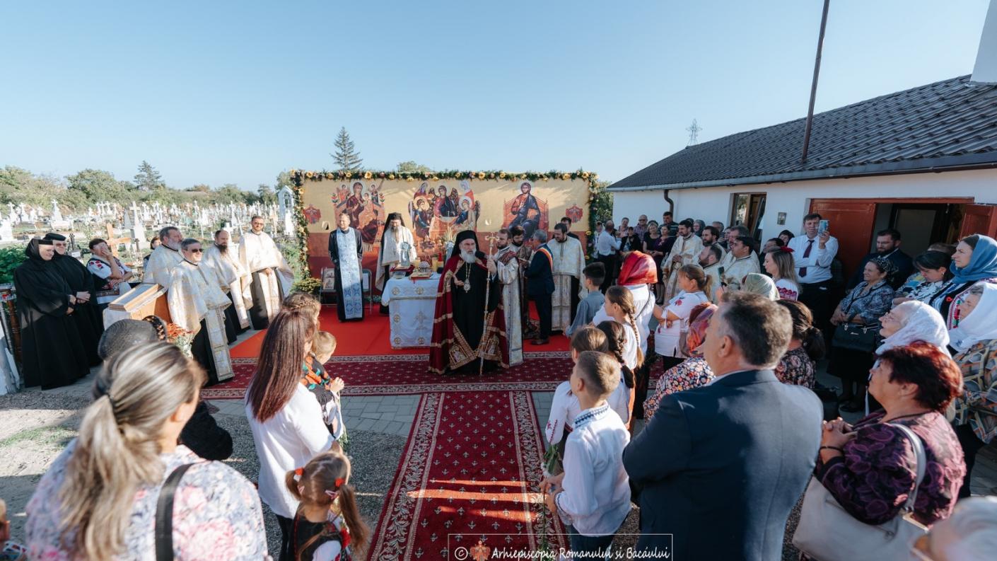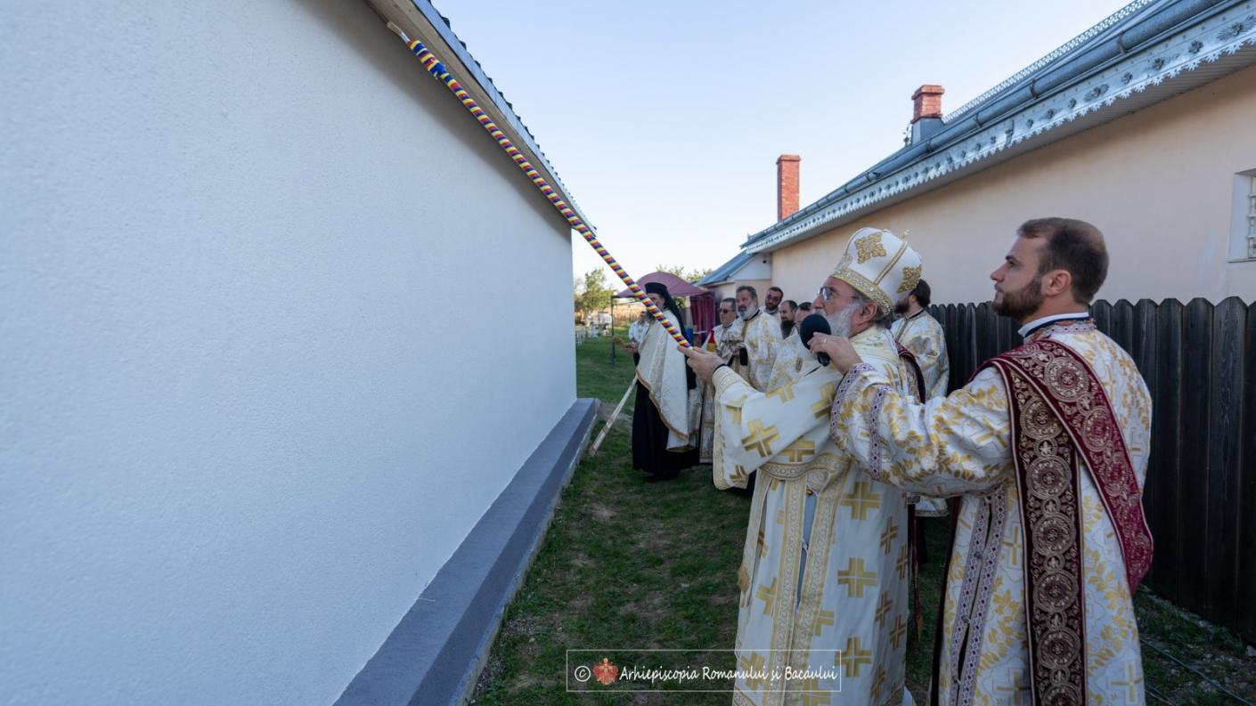 În prezența pelerinilor și a enoriașilor, după oficierea Sfintei Litughii, în glas de cântări sfinte și sunet de clopot, soborul slujitorilor a înconjurat lăcașul de cult citind pericopele evanghelice specifice, în cele patru puncte cardinale, iar Înaltpreasfințitul Părinte Ioachim a însemnat cu Sfântul și Marele Mir pereții bisericii. La interior au fost sfințite Sfântul Altar și Sfânta Masă, apoi icoanele murale. Cu acest prilej, pelerinii și membrii comunității parohiale au avut bucuria de a se închina unui fragment din moaștele Sfântului Ierarh Martir Teodosie de la Brazi, Episcopul Romanului, așezat într-un chivot, în piciorul Sfintei Mese.