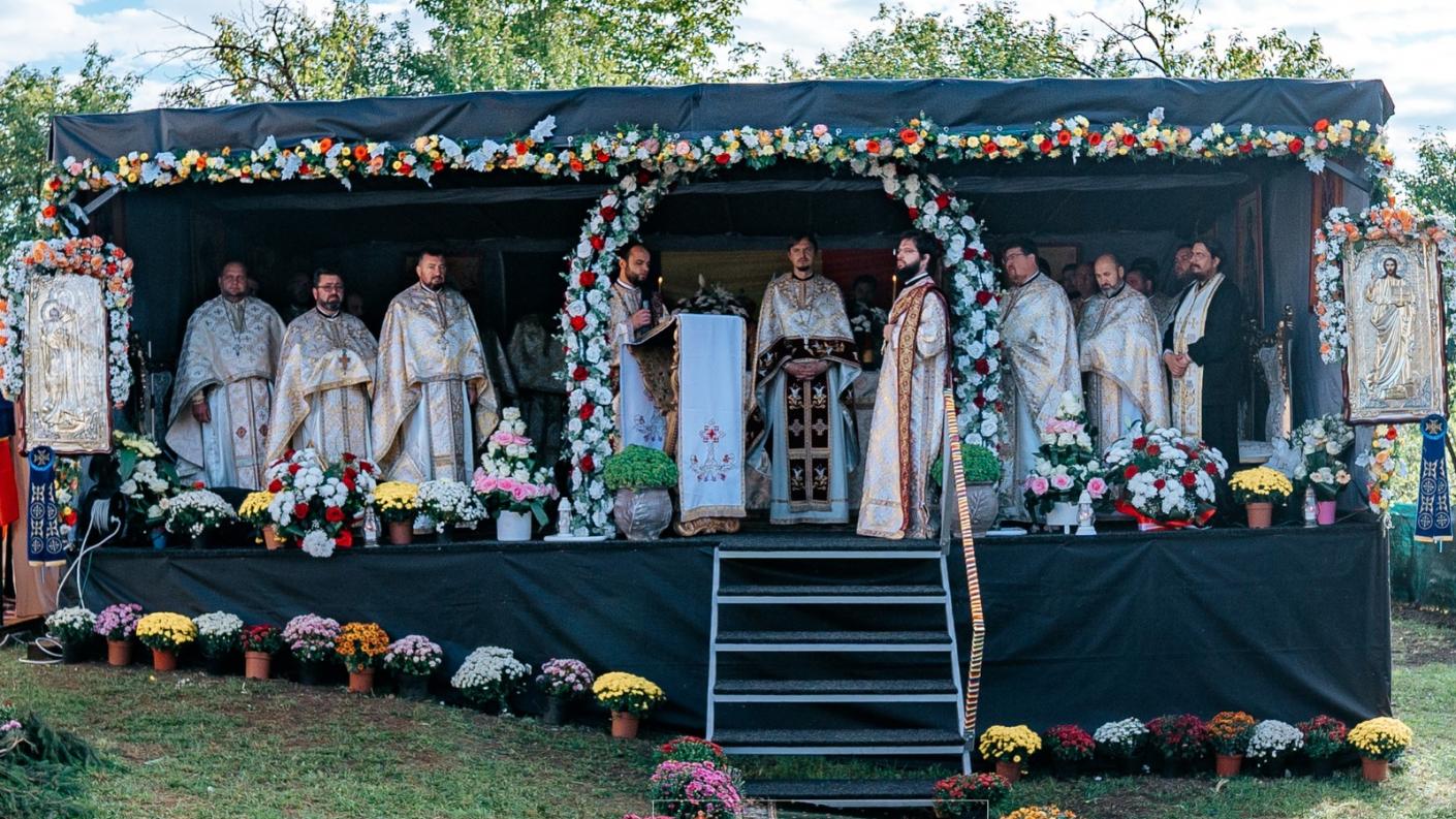 Încă de la primele ore ale dimineții, a fost săvârșită Sfânta și Dumnezeiasca Liturghie de un sobor de preoți și diaconi, sub coordonarea preotului protopop Grigoraș Alexandru. După Sfânta Liturghie a fost săvârșită slujba de resfințire a bisericii cu hramurile „Tăierea capului Sfântului Ioan Botezătorul” și ”Sfântul Nicolae” de către soborul preoților și diaconilor care a înconjurat biserica citind pericopele evanghelice specifice, iar Înaltpreasfințitul Părinte Ioachim a însemnat la exterior cu Sfântul și Marele Mir, în semnul Sfintei Cruci, cele patru laturi ale edificiului. Apoi, au fost sfințite altarul și pictura murală, oferindu-se credincioșilor posibilitatea de a se închina sfintelor moaște ale Sfântului Mucenic Teodosie de la Brazi, Episcopul Romanului, așezate în piciorul Sfintei Mese.