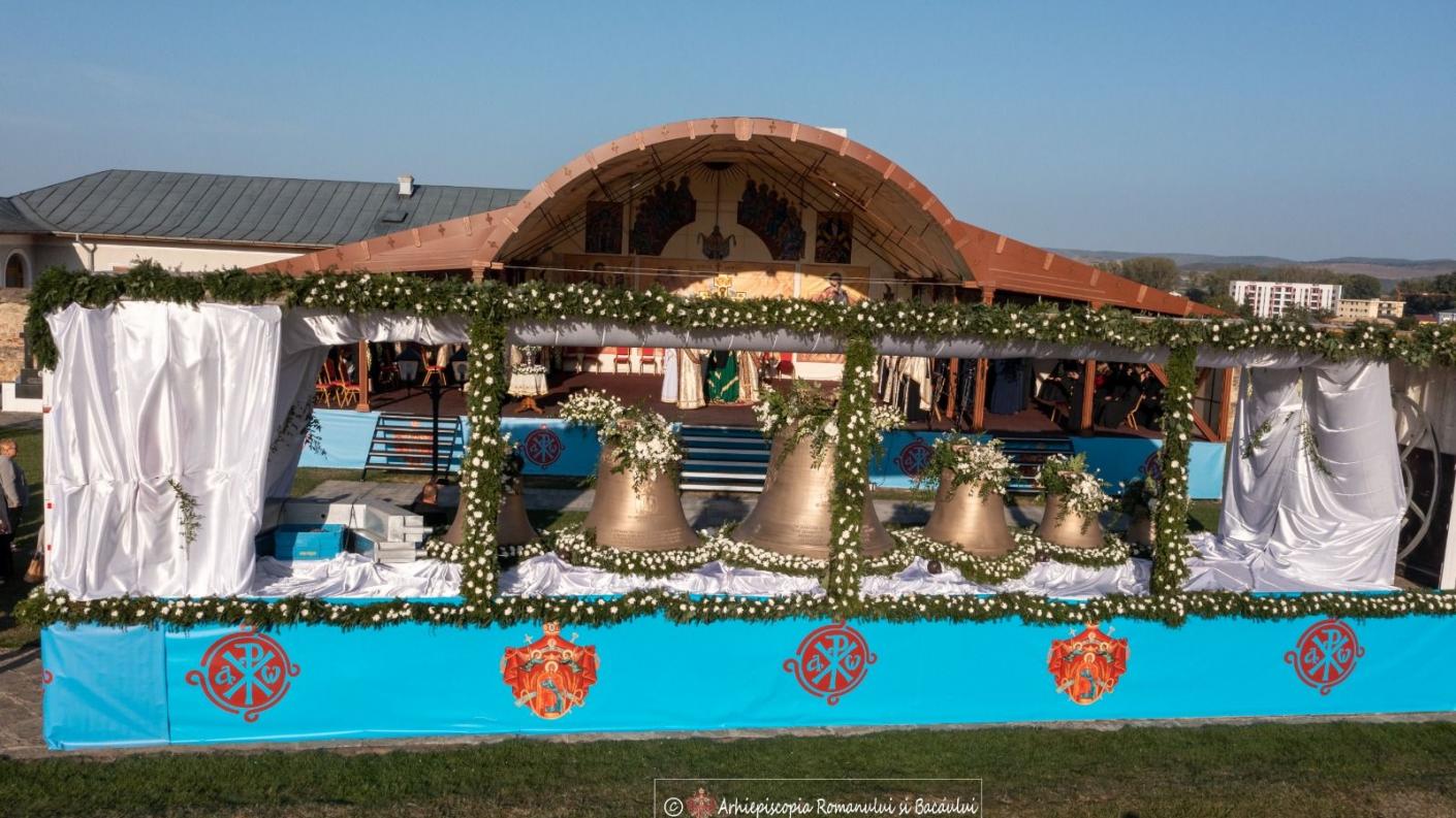 Referindu-se la momentul aducerii și sfințirii lor, Înaltpreasfinția sa a remarcat faptul că acesta nu este întâmplător, deoarece unul dintre clopote poartă pe el icoana Sfintei Parascheva care este ocrotitoarea Eparhiei și hramul Catedralei arhiepiscopale, iar sfinții ale căror chipuri sunt zugrăvite pe latura exterioară a fiecărui clopot vor fi mijlocitori în rugăciune prin glasurile clopotelor pentru fiii și fiicele Arhiepiscopiei Romanului și Bacăului: