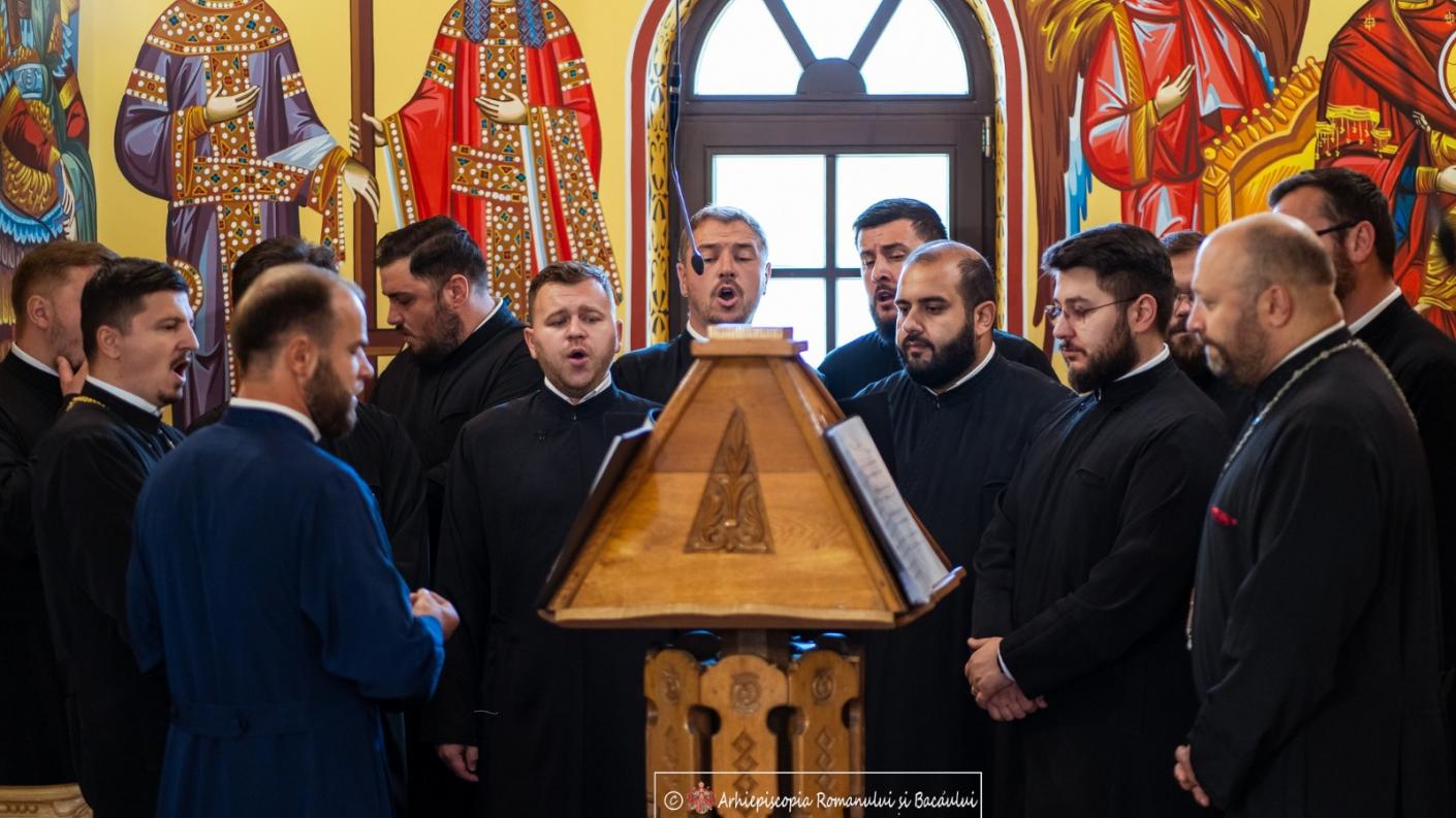 Răspunsurile la Sfânta Liturghie au fost oferite de Corul Diaconia al Catedralei arhiepiscopale „Sfânta Cuvioasă Parascheva” din Roman. (Pr. Valentin Băltoi)