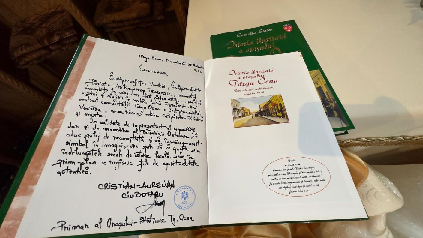 Domnul primar al stațiunii Târgu Ocna a oferit în dar Părintelui Arhiepiscop Teodosie volumul „Târgul anilor romantici. Un secol de istorie ilustrată a orașului Târgu Ocna”, volum ce îl are ca autor pe domnul Corneliu Stoica, iar soborul părinților slujitori a oferit, prin părintele paroh Andrei Silviu Neicu, o icoană a Maicii Domnului, ocrotitoarea sfântului lăcaș, ce este cunoscut de către locuitorii orașului ca fiind catedrala acestuia. Zidită în secolul al XVII-lea și rectitorită de arhimandritul Damaschin Iviritul în secolul al XIX-lea, fiind ultima ctitorie a domnilor greci înainte de venirea la putere a domnitorului Alexandru Ioan Cuza, biserica Precista, fostă mănăstire pănâ în anul 1885, atrage și impresionează prin frumusețea și farmecul aparte.