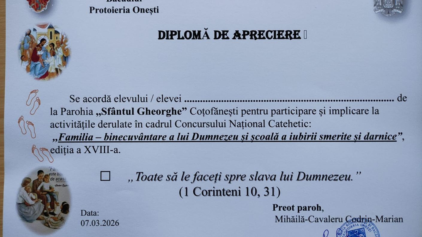 Cu binecuvântarea Înaltpreasfințitului Părinte Ioachim, Arhiepiscopul Romanului și Bacăului, duminică, 8 martie 2026, la Biserica „Sfântul Gheorghe” din Cotofănești a avut loc cea de-a treia întâlnire din cadrul Concursului Național Catehetic, desfășurată sub tema „Familia – sprijinul meu atunci când viața devine complicată”.