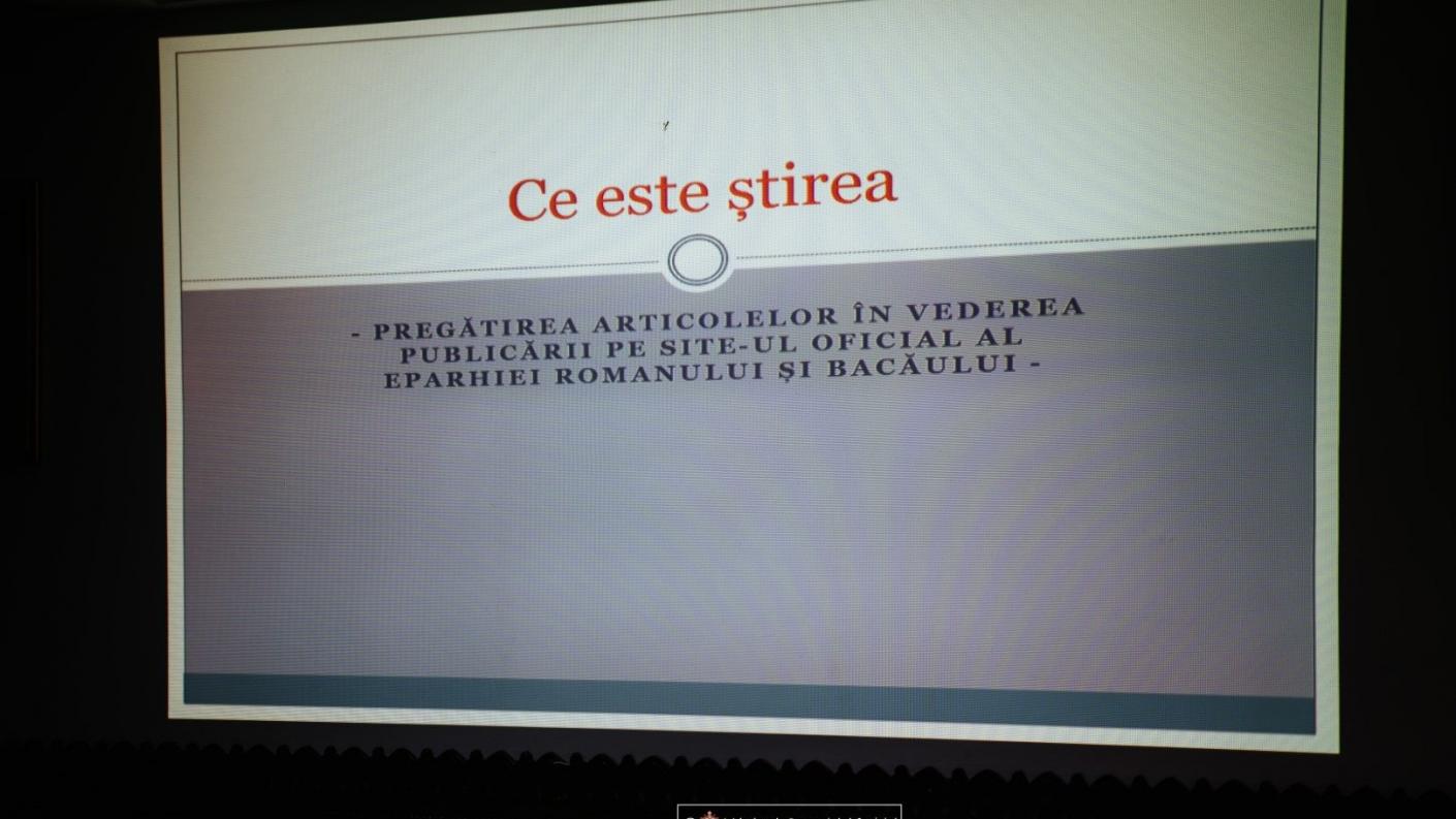 În deschiderea ședinței, părintele Alexandru Zamfir, consilier și purtător de cuvânt al Centrului eparhial de la Roman a amintit câteva aspecte referitoare la modul în care trebuie reflectată activitatea Bisericii în spațiul virtual, cu discernământ și bună-cuviință, făcând și din evenimentele frumoase o știre. În cuvântul rostit cu acest prilej, pr. consilier Alexandru Zamfir a precizat: „Într-o perioadă în care informația circulă foarte repede, într-un timp în care acuratețea, conținutul și consistența ei sunt preferabile, cei prezenți astăzi aici sunteți micii cronicari ai vremurilor noi, aveți o responsabilitate foarte mare și ceea ce împliniți, cu sacrificii uneori, ne reprezintă și rămâne în timp ca mărturie a tuturor celor ce se împlinesc în teritoriu spre slava lui Dumnezeu și întru slujba oamenilor.”