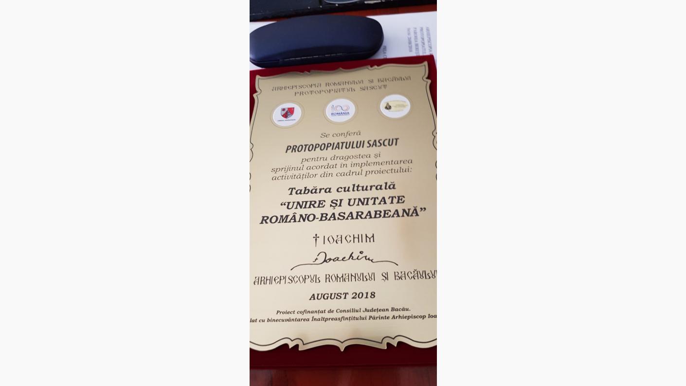 În sala de ședințe a Protoieriei Sascut a avut loc vineri, 24 august 2018, cu binecuvântarea Înaltpreasfințitului Părinte Ioachim, Arhiepiscopul Romanului și Bacăului, și sub coordonarea părintelui protoiereu Negoiță Ioan, sesiunea festivă de încheiere a Taberei Culturale: "Unire și Unitate Româno - Basarabeană", organizată de Fundația "Episcop Melchisedec"- Filiala Bacău, proiect cofinanțat de Consiliul Județean Bacău și susținut de Protopopiatul Sascut în parteneriat cu Școala Gimnazială și Liceul "J.M. Elias”.