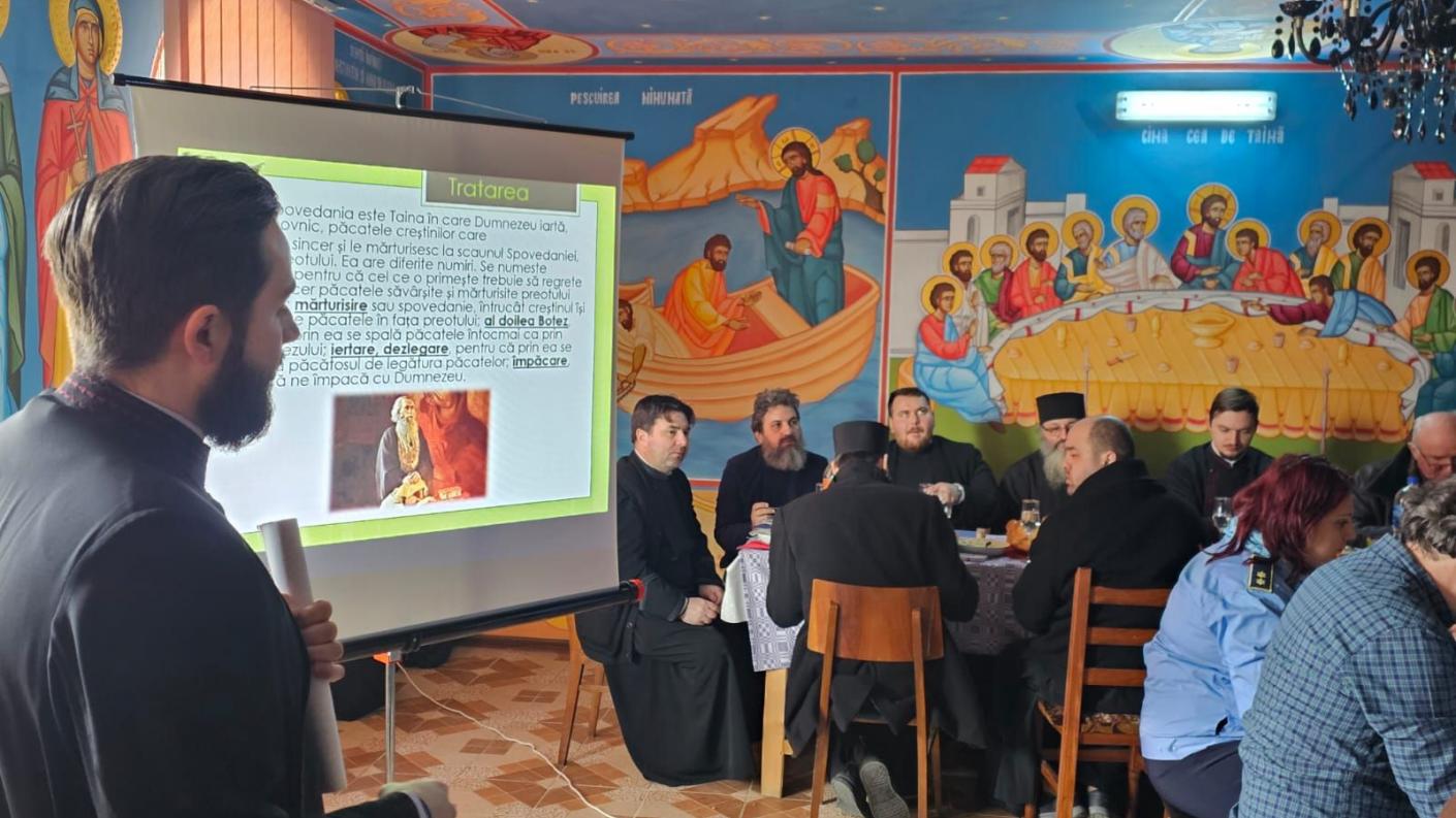 Activitățile dedicate întrunirii cercului pastoral au continuat în sala de prăznuire a parohiei, unde într-o ambianță de prietenie și comuniune, părintele Alexandru-Ionuț Apostu, asistent social al Protoieriei Sascut, a prezentat înaintea tuturor o frumoasă cateheză ce reliefează Taina Spovedaniei și modul în care aceasta trebuie împlinită, dar și foloasele ce decurg din săvârșirea ei în viața creștinului, punând accent pe întoarcerea fiecăruia în brațele Tatălui care necontenit iartă pe cel ce își asumă păcatele săvârșite și dorește o schimbare sinceră a vieții.