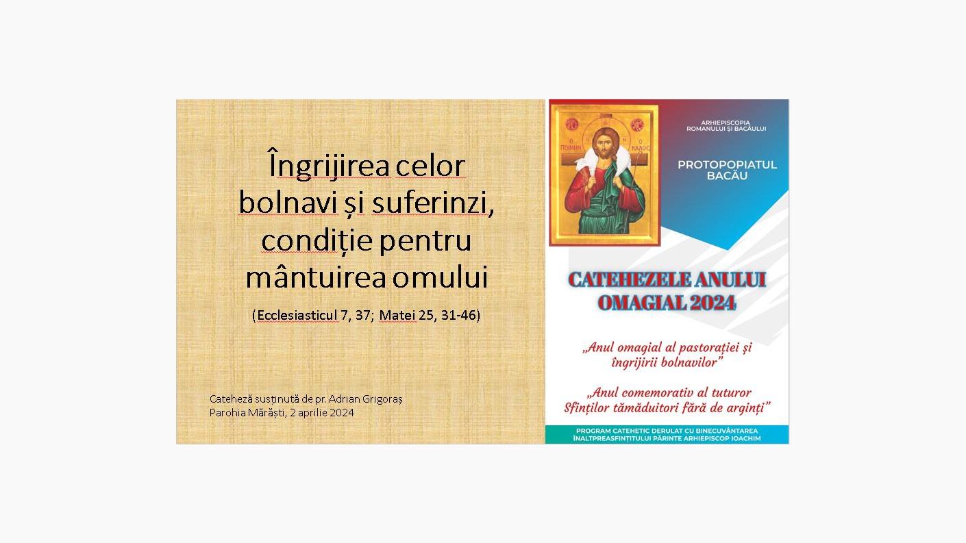 Ziua a debutat cu săvârșirea Tainei Sfântului Maslu de către preoţii din parohiile apartenente Cercului pastoral, alături de un număr impresionant de credincioși. După săvârșirea Tainei Sfântului Maslu, în contextul Anului Omagial al pastorației și îngrijirii bolnavilor și al Anului comemorativ al tuturor Sfinților tămăduitori fără de arginți, părintele Adrian Grigoraș, paroh al Parohiei Fruntești, a susținut în fața tuturor celor prezenți cateheza cu titlul „Îngrijirea celor bolnavi și suferinzi, condiție pentru mântuirea omului” (Ecclesiasticul 7,37; Matei 25, 31-46).