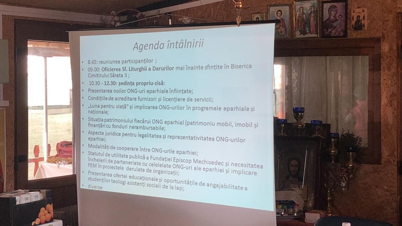 Pe ordinea de zi s-a aflat mai întâi prezentarea noilor membri, a ONG-urile nou-înființate în Eparhie ce au aderat la această comisie și activitatea fiecăruia. S-a discutat de asemenea despre demersul a două așezăminte monahale, respectiv Mănăstirea Răchitoasa și Mănăstirea Giurgeni, ce doresc să înființeze ONG-uri și respectiv servicii sociale acreditate adaptate nevoilor fiecărei regiuni în care activează.