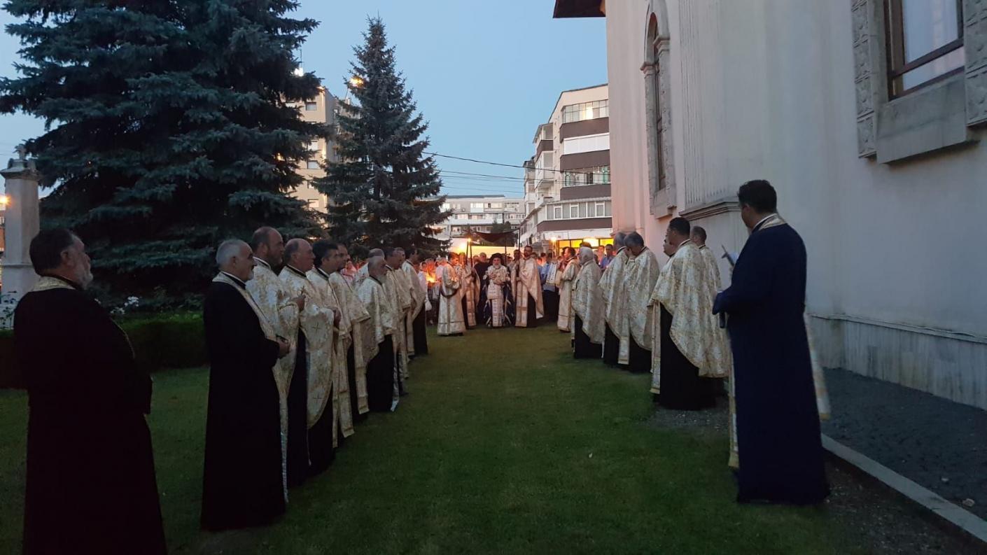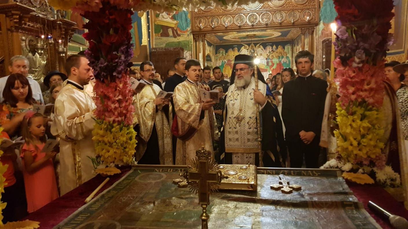 Înaltpreasfinția Sa, cu Sfânta Evanghelie și Sfânta Cruce în mâini, aflat sub crotirea Sfântului Aer purtat de patru preoți, s-a oprit în cele patru laturi ale bisericii binecuvântând pe credincioși după fiecare ectenie specială rostită de arhidiaconi. După înconjurarea sfântului lăcaș, credincioșii au sărutat Sfânta Evanghelie și Sfânta Cruce așezate pe un analog la intrarea în biserică, iar Ierarhul i-a miruit.