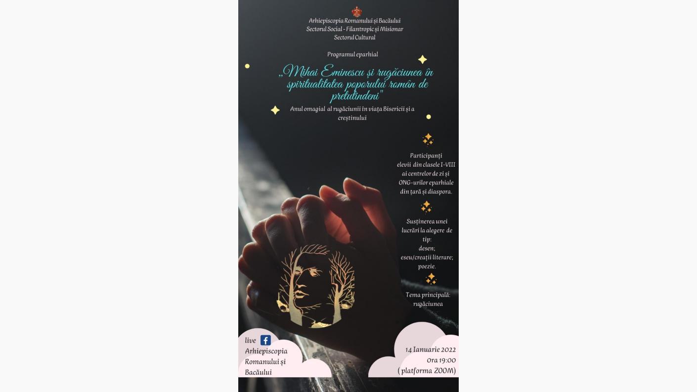 Ca un preambul al Zilei Culturii Naționale, în seara zilei de 14 ianuarie 2022, începând cu ora 19, (cum ziua liturgica începe cu Slujba Vecerniei după principiul a fost seară și apoi dimineață...), a avut loc evenimentul online "Mihai Eminescu și rugăciunea în spiritualitatea poporului român de pretutindeni", desfășurat de Sectorul Social-Filantropic și Sectorul Cultural al Arhiepiscopiei Romanului și Bacăului, în parteneriat cu Inspectoratul Școlar Județean Bacău, desfășurat în prezenta și cu binecuvântarea ÎPS Ioachim, Arhiepiscopul Romanului și Bacăului.