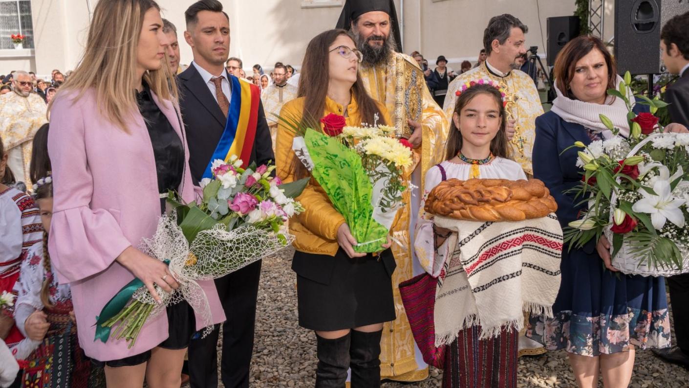Edificiul eclesial, construit în plan treflat și cu formă arhitecturală de navă, a primit apoi haina resfințirii, eveniment la care au fost prezente și oficialități județene și locale.