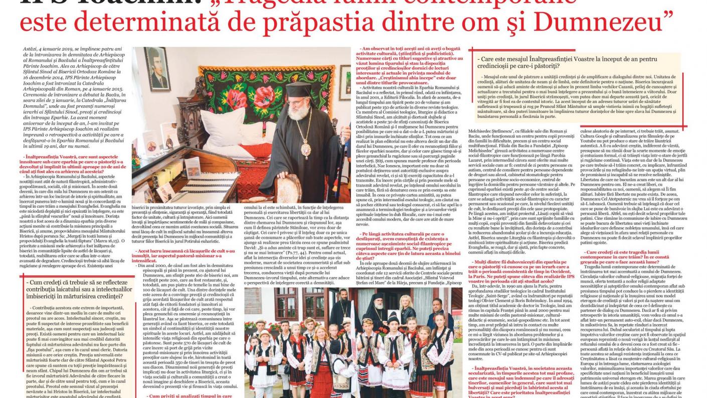 La acest moment aniversar de la început de an, la invitația cotidianului băcăuan Deșteptarea, IPS Părinte Arhiepiscop Ioachim a prezentat într-un interviu o retrospectivă a activității pe care a desfășurat-o în Eparhia Romanului și Bacăului în ultimii 19 ani, dar nu numai.