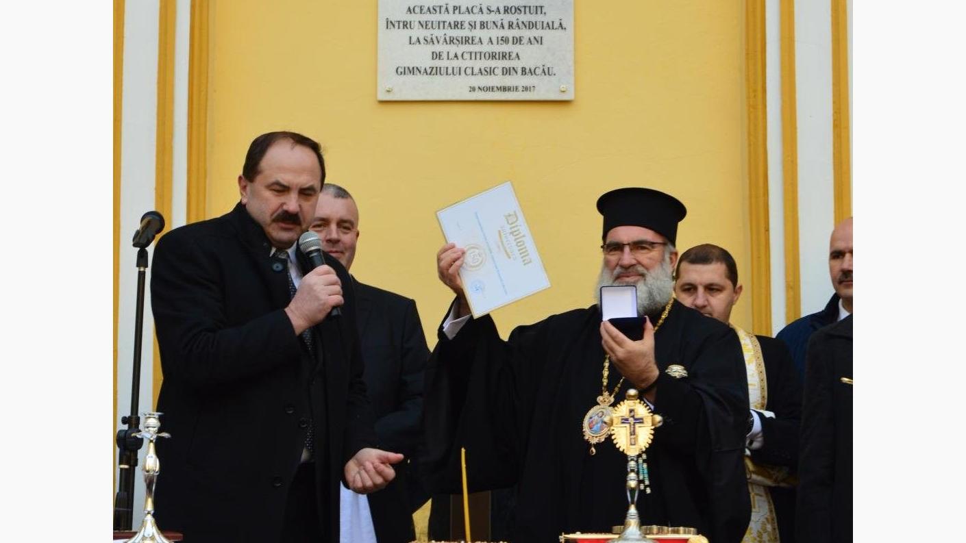 Domnul Nicu-Vasile Harasemciuc, directorul principal al Colegiului Național „Ferdinand I”, a oferit Ierarhului, la final, în semn de aleasă prețuire, o diploma aniversară, precum și medalia omagială la această sărbătoare.