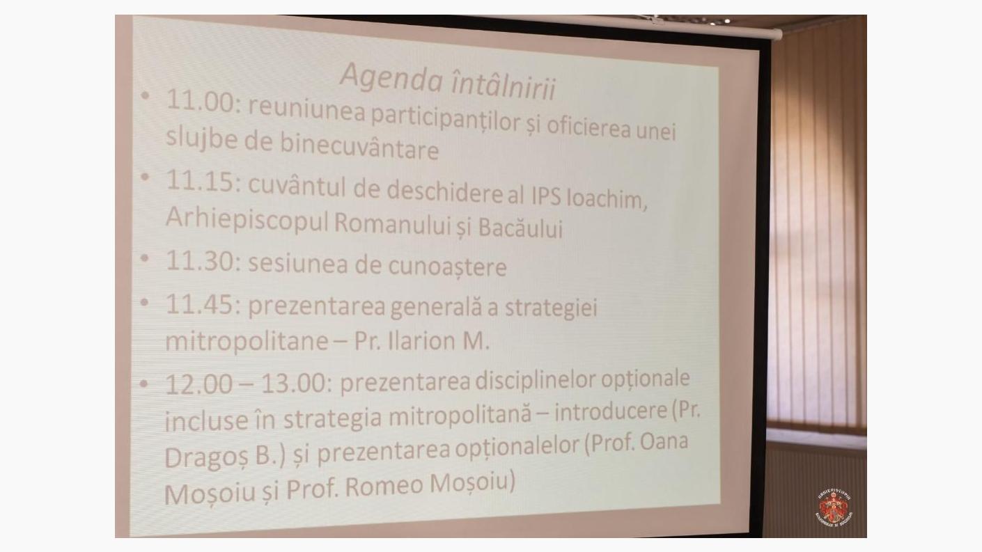 După sesiunea de cunoaștere, pr. Ilarion Mâță a realizat prezentarea generală a Strategiei mitropolitane „Educația pentru viață”, iar pr. Dragoș Bălinișteanu a introdus tema legată de disciplinele opționale.