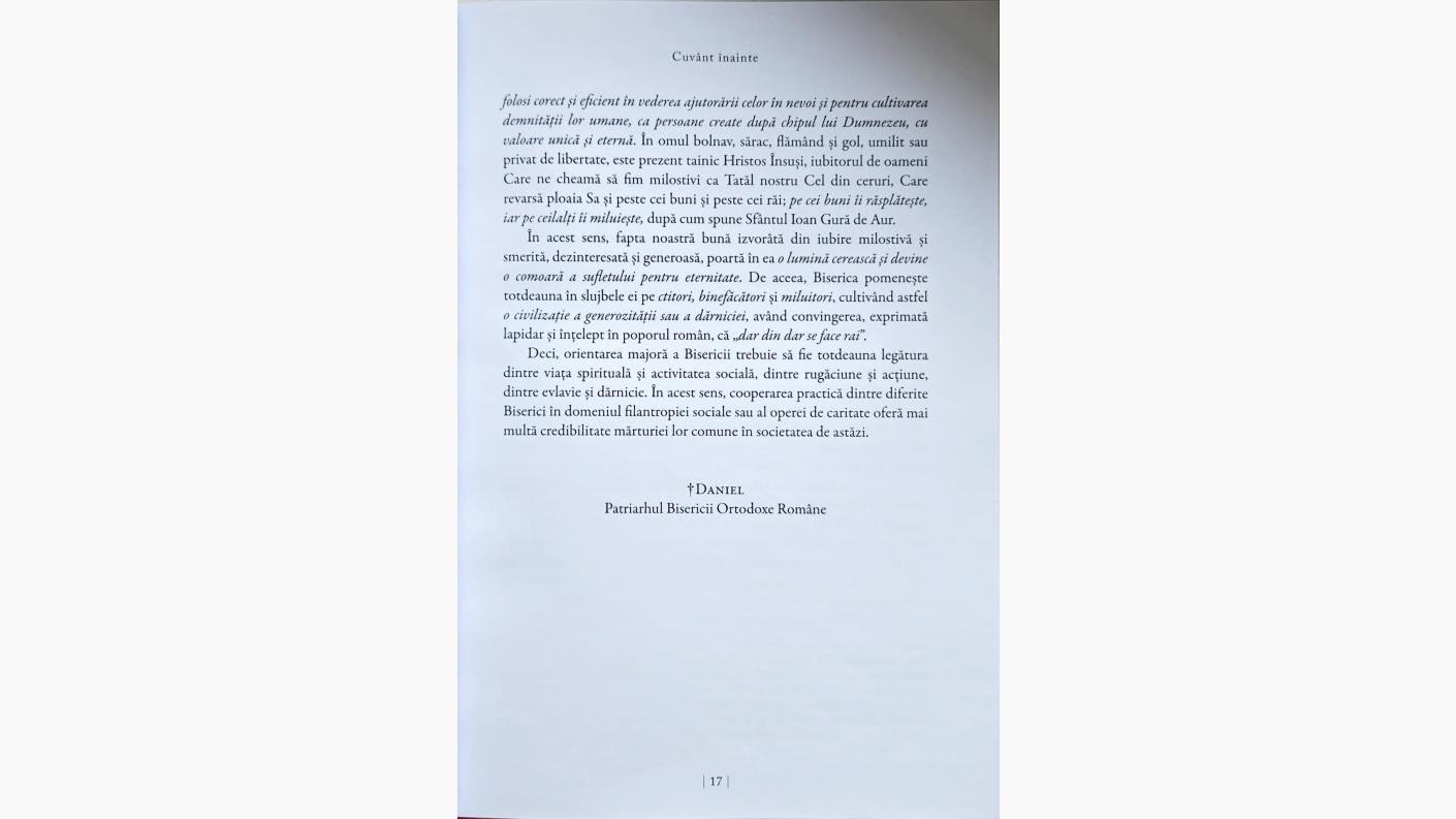 În Cuvântul înainte al volumului, Patriarhul Bisericii Ortodoxe Române, †Daniel, subliniază dimensiunea profund spirituală a lucrării sociale a Bisericii: