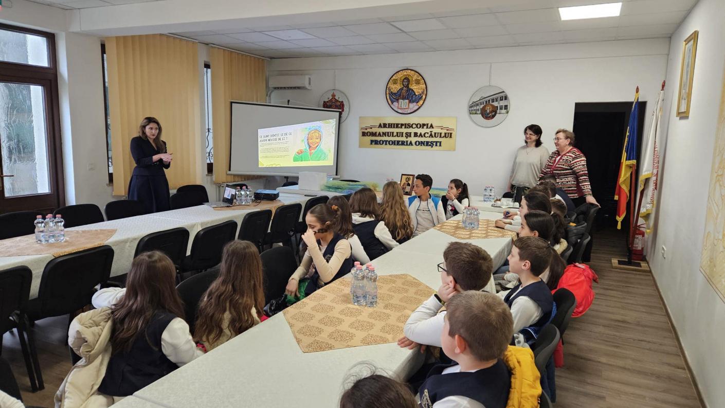 Școlarii, însoțiți de doamna profesoară pentru învățământ primar, Marta Pânzaru, au poposit în sala de festivități a Protopopiatului. Aici au fost întâmpinați de părintele Nicolae Zaharia, protoiereu de Onești și de doamna Mihaela Chircu, asistentul social al Protoieriei, care au prezentat micilor școlari sediul instituției și o parte dintre activitățile sociale pe care aceasta le desfășoară.