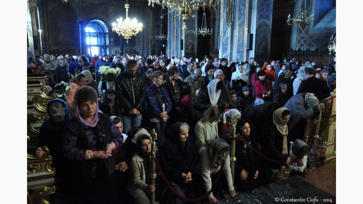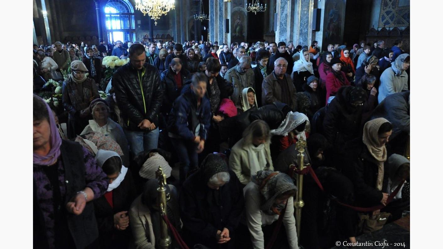 Credincioşii au participat în număr mare sâmbătă, 11 octombrie 2014, la slujba Sfintei Liturghii oficiată în Catedrala Mitropolitană din Iaşi de Preasfinţitul Părinte Ioachim Băcăuanul. Ierarhul de la Roman a adresat la finalul slujbei un cuvânt de învăţătură în care a vorbit despre "sfinţii neamurilor" şi despre cultul Sfintei Parascheva. "Orice popor deţine personalităţi care au devenit definitorii pentru cultura lui naţională. Poporul român, creştin din sorgintea sa, este un exemplu concludent în acest sens. În spiritualitatea românească este evident faptul că vrednici de laudă sunt martirii, care s-au jertfit pentru dreapta credinţă. În lucrarea duhovnicească a oamenilor, Mântuitorul Hristos a ales între sfinţii neamurilor, în toate timpurile şi locurile, pe viitorii prieteni şi casnici ai Săi. Între multitudinea sfinţilor, al căror nume şi număr le ştie doar Dumnezeu, este şi Sfânta Cuvioasă Parascheva. Viaţa ei ni se înfăţişează ca o necontenită descoperire a ceea ce înseamnă voia lui Dumnezeu şi puterea dată de El unor fiinţe alese, pentru a le face lucrătoare ale binelui în lume şi ajutor în sprijinul semenilor aflaţi în nevoie. Este mai presus de înţelegere modul în care Sfânta Parascheva ocroteşte lumea adusă de Dumnezeu din nefiinţă. Cuvioasa Parascheva adună an de an la Iaşi sute de mii de pelerini. Bisericile ocrotite de această sfântă pe toată suprafaţa pământului mărturisesc credinţa neclintită în puterea dată Sfintei Parascheva. Minunile ei sunt mai multe decât nisipul mării", a spus Preasfinţitul Părinte Ioachim Băcăuanul. Pe parcursul Sfintei Liturghii, pelerinii de toate vârstele au aşteptat să se închine la racla Sfintei Parascheva, precum şi la icoana Sfântului Constantin Brâncoveanu, în interiorul căreia se află un fragment din moaştele martirului.