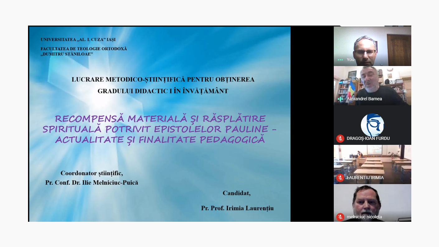 În prezența unei alte comisii de evaluare, alcătuită din pr. conf. univ. dr. Alexăndrel Barnea, pr. conf. univ. dr. Ilie Melniciuc - Puică, cadre didactice ale Facultății de Teologie Ortodoxă ”Dumitru Stăniloae” din Iași și pr. prof. dr. Adrian Alexandrescu, a avut loc, în cadrul Liceului cu Program Sportiv din Bacău, susținerea lucrării pentru obținerea gradului didactic I în învățământ, intitulată ”Recompensă materială și răsplătire spirituală potrivit epistolelor pauline. Actualitate și finalitate pedagogică, a părintelui Laurențiu Irimia, profesor pentru disciplina religie în cadrul unității școlare amintite.