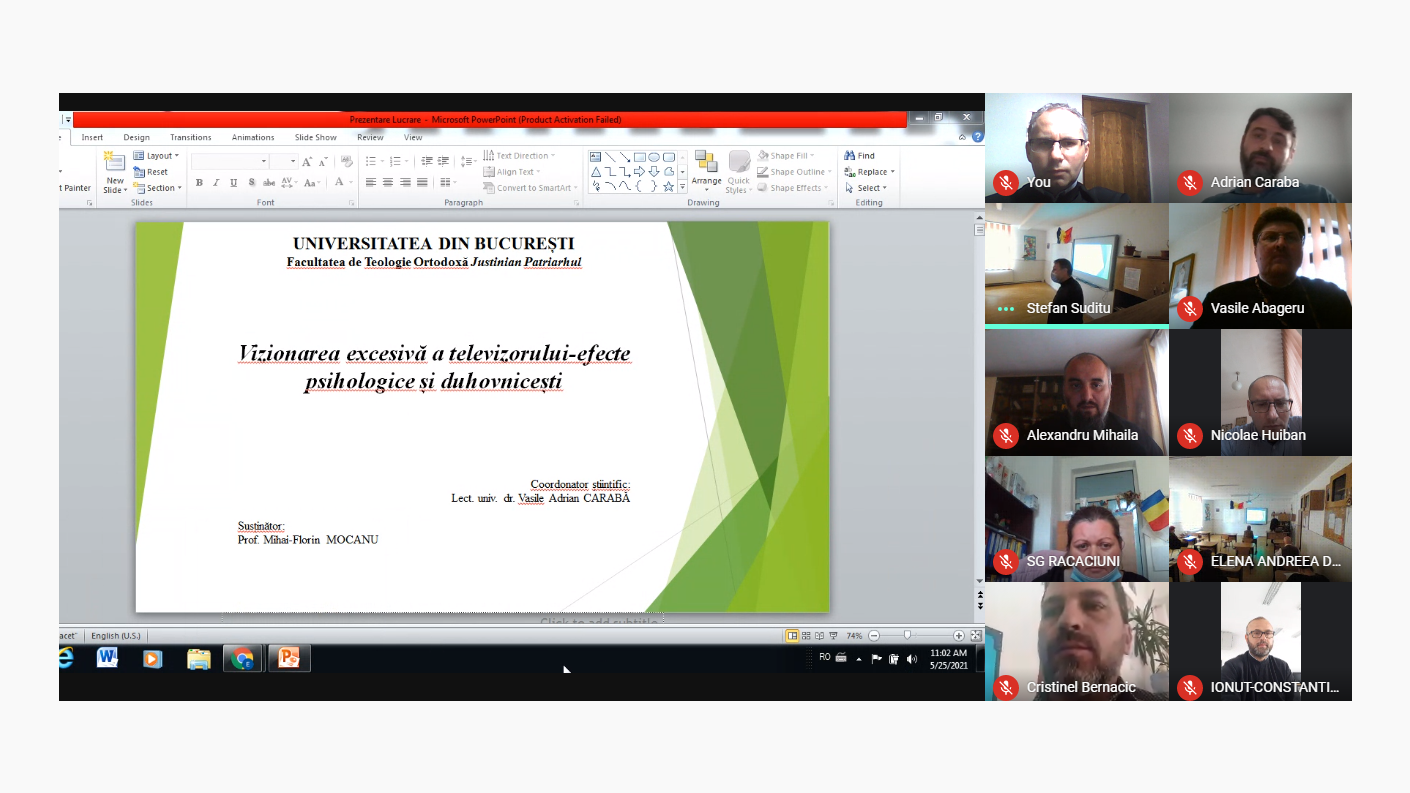 Marți, 25 mai 2021, în prezența unei comisii de evaluare alcătuită din pr. lect. univ. dr. Alexandru Mihăilă, lect. univ. dr. Adrian Carabă, cadre didactice ale Facultății de Teologie Ortodoxă ”Justinin Patriarhul” din București și pr. prof. dr. Adrian Alexandrescu, a avut loc susținerea lucrării pentru obținerea gradului didactic I în învățământ, intitulată ”Vizionarea excesivă a televizorului. Efecte psihologice și duhovnicești”, elaborată de către părintele profesor Mihai - Florin Mocanu, cadru didactic pentru disciplina religie în cadrul Școlii Gimnaziale Răcăciuni.