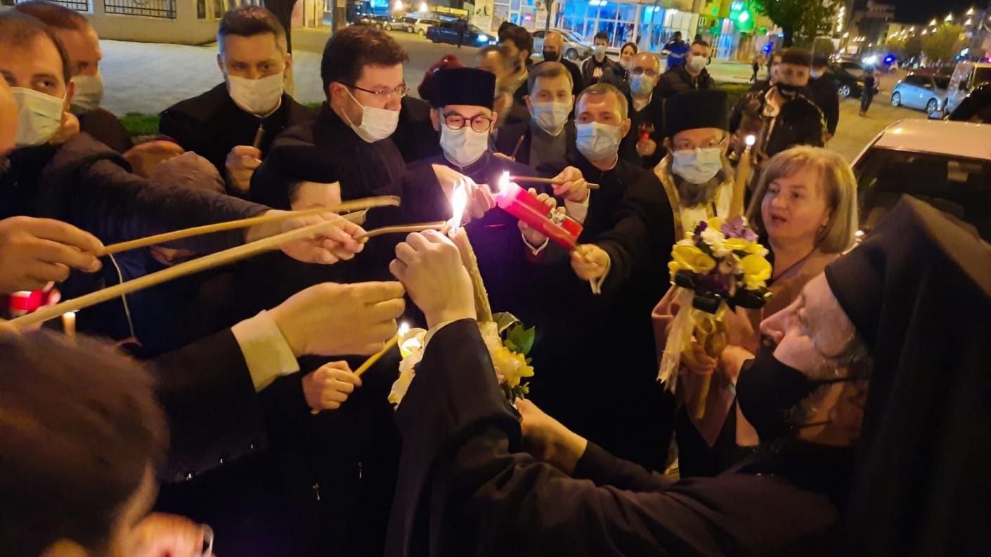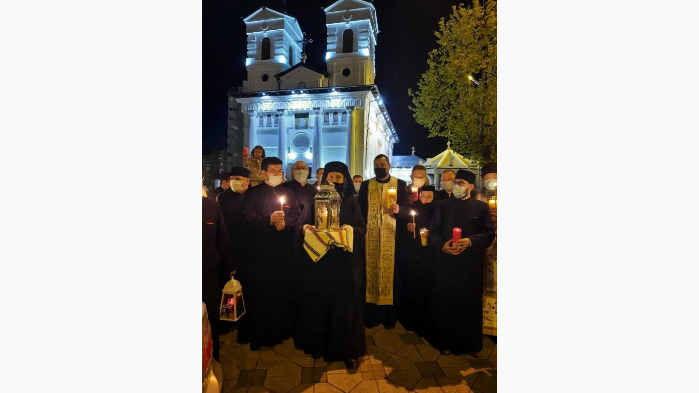 La ora 23.00, Lumina Sfântă de la biserica Sfântului Mormânt din Ierusalim a ajuns și la Roman, unde a fost așezată pe Sfânta Masă din Catedrala Arhiepiscopală ”Sf. Cuv. Parascheva”.