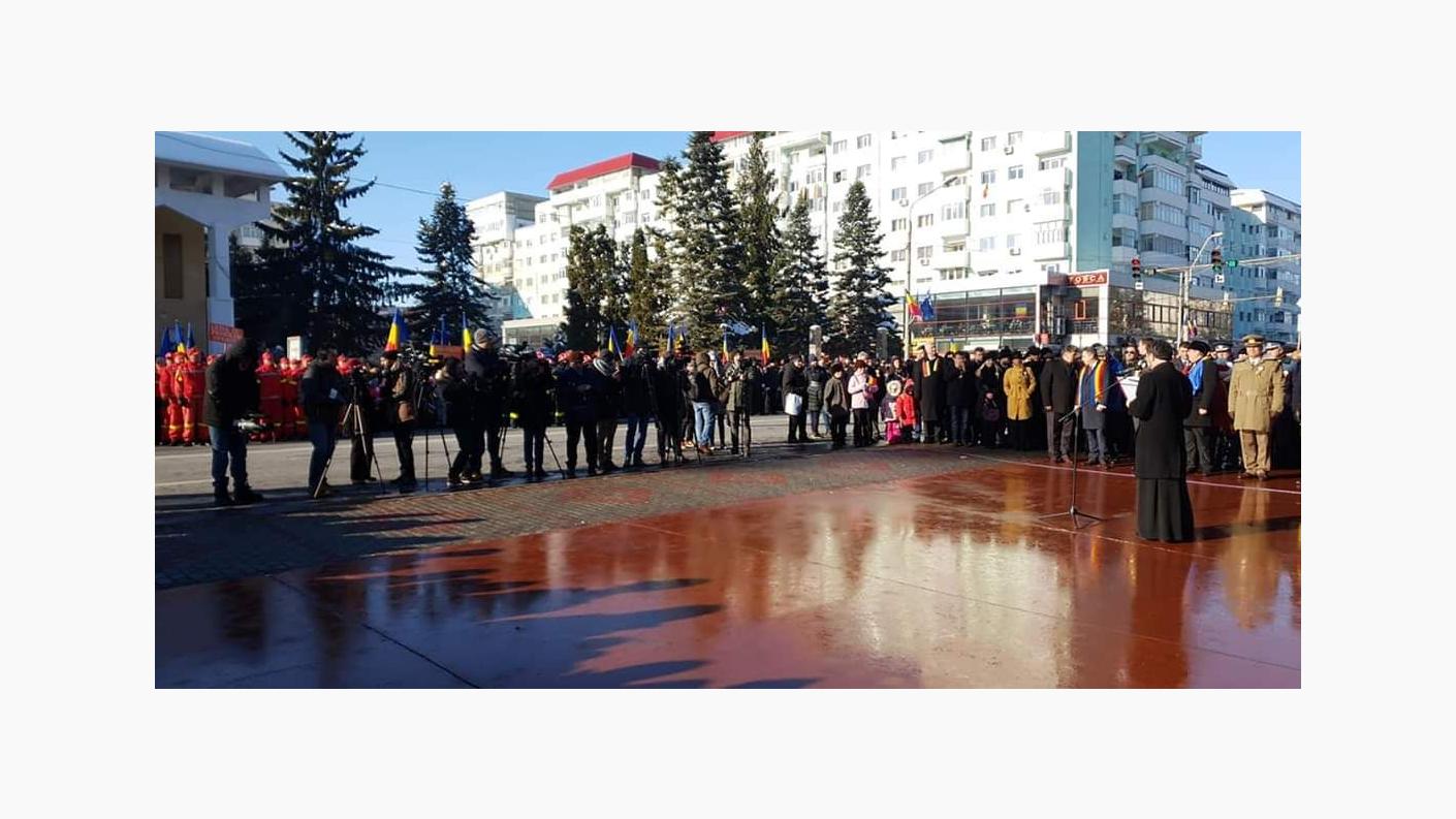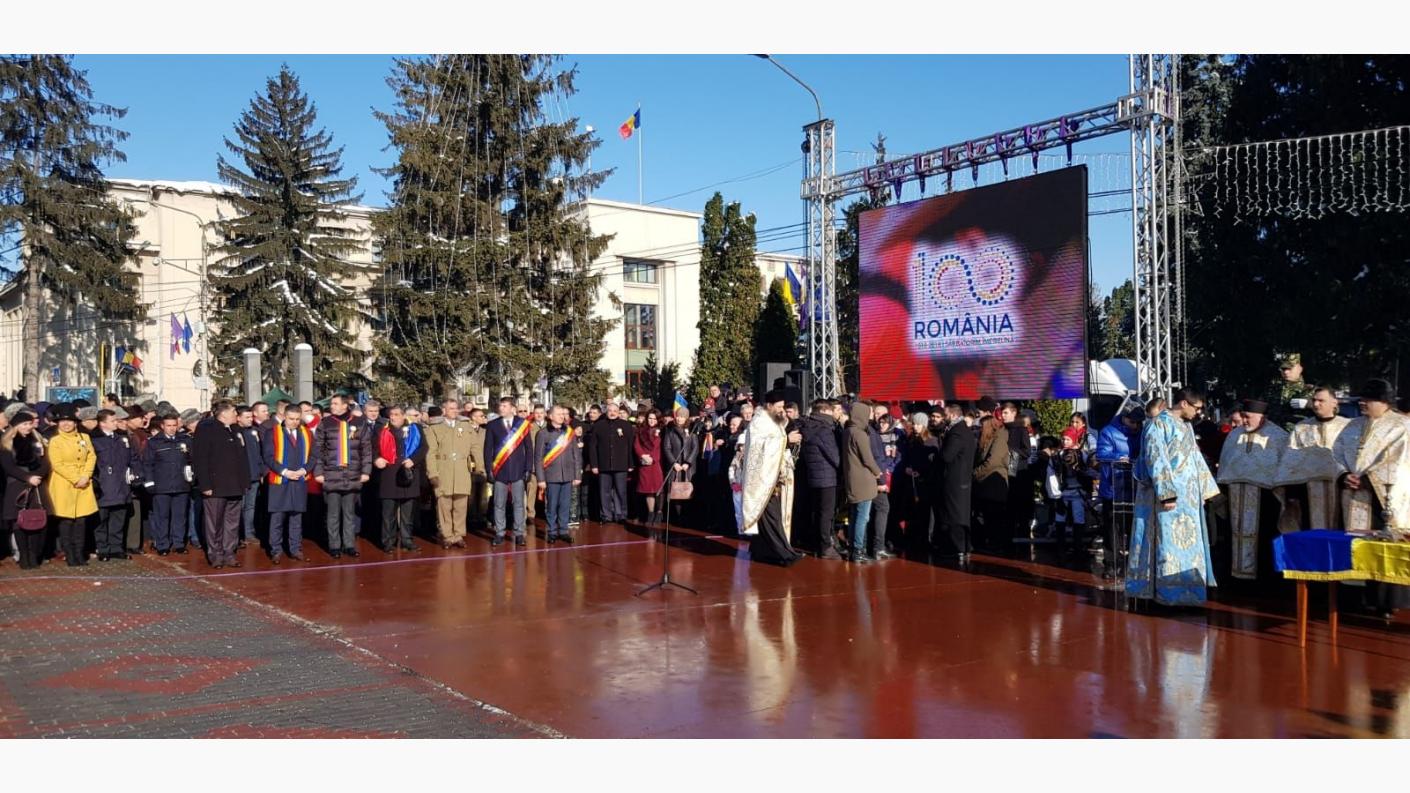 Activitățile dedicate Zilei Naționale a României au debutat cu intonarea Imnului de stat de către un grup de tineri, reprezentanți ai tuturor etniilor din Roman, apoi a urmat oficierea slujbei de Te Deum de către un sobor de preoți din Protopopiatul Roman, sub protia părintelui Arhimandrit Pimen Costea, vicar eparhial, delegatul Înaltpreasfințitului Părinte Ioachim la acest eveniment. După oficierea slujbei de Te Deum a fost rostit mesajul Înaltpreasfințitului Părinte Ioachim, Arhiepiscopul Romanului și Bacăului, urmat alocuțiunile oficialităților județene și locale care au subliniat însemnătatea acestei zile pentru românii de pretutindeni și pentru romașcani, în special. Totodată a fost transmis și mesajul invitaților din orașul basarabean Ștefan Vodă, înfrățit cu municipiul Roman din anul 2013, prin care s-a subliniat importanța acestei zile pentru românii de pretutndeni.