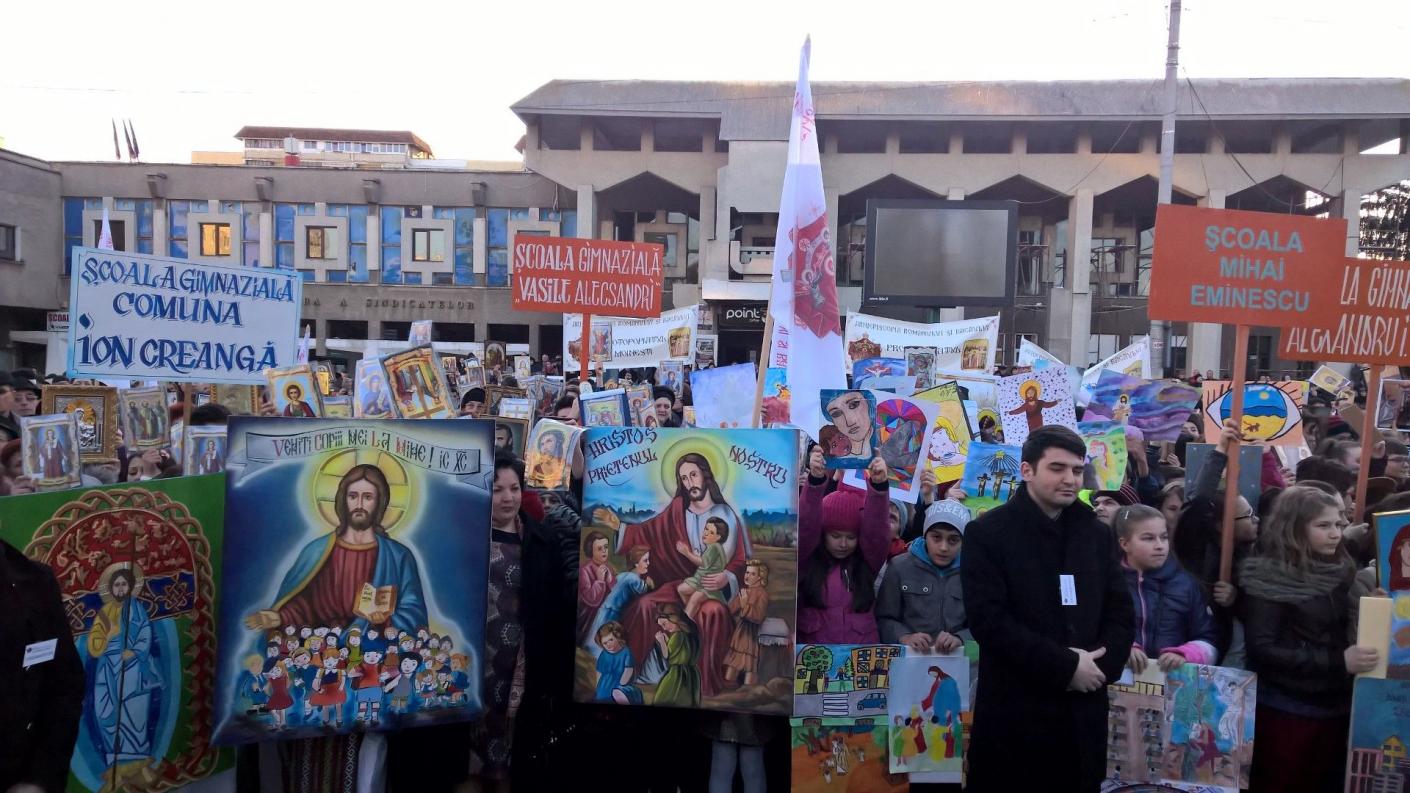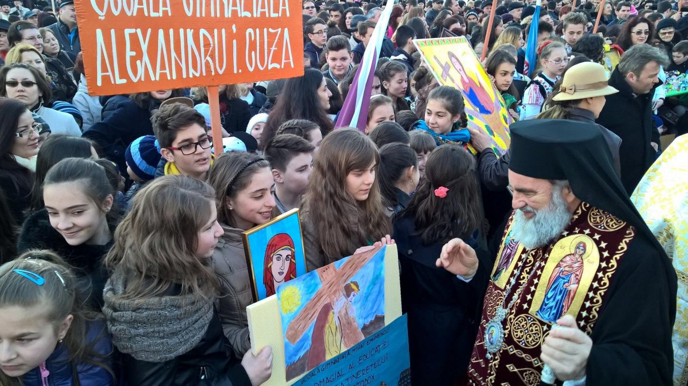 Sărbătoarea a continuat cu prezentarea și jurizarea icoanelor realizate de elevii romașcani, participanți la concursul ”Iisus Hristos, modelul suprem pentru tinerii școlari”, de către o echipă alcătuită din reprezentanți ai Bisericii și ai artelor plastice. Frumusețea și expresivitatea imaginilor sacre, așa cum sunt înțelese de către copii, au transformat spațiul public romașcan într-o veritabilă agoră creștină, în care iubirea sfinților s-a transpus în chipurile icoanelor pictate magistral. ”Aici, Ortodoxia s-a împletit cu Ortopraxia”, a declarat ierarhul care, binecuvântându-i pe copii, a amintit faptul că ”credința și cumințenia poporului român izvorăsc din credința în Hristos”. În sunet de toacă și în dangăt de clopote, mulțimea s-a îndreptat în procesiune spre Catedrala Arhiepiscopală ”Sf. Cuv. Parascheva” a cărei curte, după câteva zeci de minute, avea să se dovedească a fi neîncăpătoare. Dincolo de dimensiunea sacră a evenimentului, prin prezența la procesiunea din Duminica Ortodoxiei, cele câteva sute de tineri și-au manifestat apartenența la învățătura și tradițiile creștinești românești și universale, prin răbdarea și bună cuviința de a cânta, de a se ruga și de a se bucura alături de Biserică pe parcursul a peste două ore. La momentul înserării, Înaltpreasfințitul Părinte Ioachim avea să-i premieze pe cei mai talentați iconari ai aceastei ediții a concursului, respectiv elevii Colegiului Tehnic ”Miron Costin”, Școala ”Mihai Eminescu” din Roman și cei ai Colegiului Național ”Roman Vodă”, oferind diplome de participare tuturor celor care s-au implicat în organizarea acestui moment. Cele trei video proiectoare oferite de organizatori ca premii tinerilor iconari au fost achiziționate prin strădania preoților din Protopopiatul Roman care au dorit prin această inițiativă să încurajeze educația religioasă în școală și să răsplătească efortul celor mai talentați elevi romașcani. (Pr. Constantin GHERASIM)