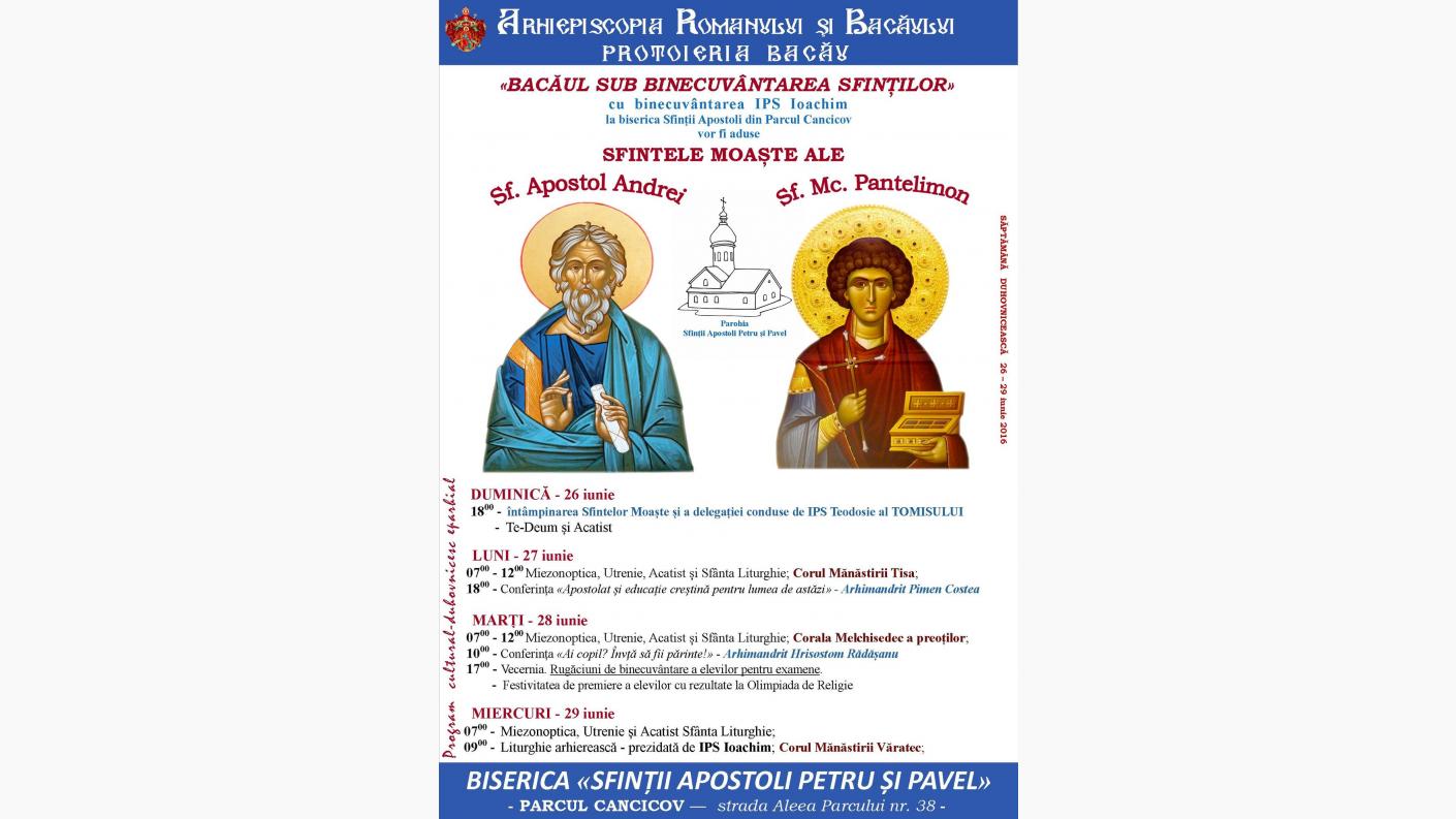 Cu binecuvântarea Înaltpreasfințitului Părinte Ioachim, Arhiepiscopul Romanului și Bacăului, duminică – 26 iunie 2016, pentru prima dată în Bacău - la biserica „Sfinții Apostoli” din Parcul Cancicov (lângă Spitalul Județean), vor fi aduse Sfintele Moaște ale Sfântului Apostol Andrei și ale Sfântului Mare Mucenic și Tămăduitor Pantelimon.